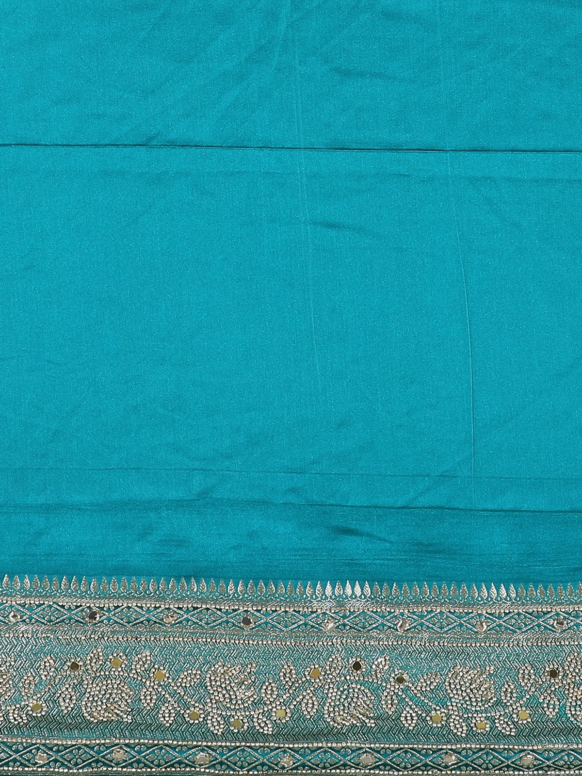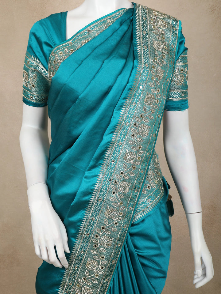 The Teal Blue Floral Embellished Satin Saree is a stunning fusion of contemporary elegance and traditional craftsmanship, featuring a luxurious satin body that drapes beautifully with a smooth, glossy sheen. The highlight of this saree lies in its intricately embellished border and pallu, adorned with dense floral motifs crafted using shimmering stones, fine thread embroidery, zari detailing, and delicate mirror accents that add a sophisticated sparkle to every movement. The pallu displays an elaborate all-over floral jaal pattern enriched with clustered stone work, giving the saree a richly ornate finish ideal for grand celebrations. Complemented by a matching embroidered blouse with embellished sleeves, this saree is perfect for weddings, receptions, festive events, and glamorous parties, offering a regal yet modern look for women who appreciate detailed handwork and luxurious draping.