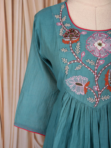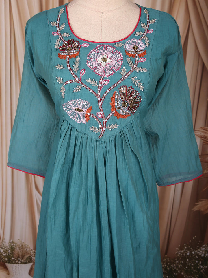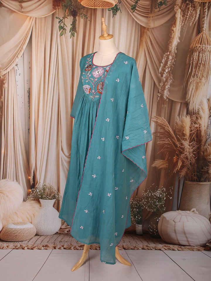 Grace your ethnic collection with this elegant Teal Blue Cotton Anarkali Kurti Set, beautifully accented with intricate floral embroidery on the yoke. The flowing silhouette with gathered detailing enhances its feminine charm, while the matching lightweight dupatta with delicate motifs and scalloped edges adds a subtle touch of grace. Perfect for festive gatherings, family occasions, or semi-formal celebrations, this ensemble exudes comfort and sophistication.