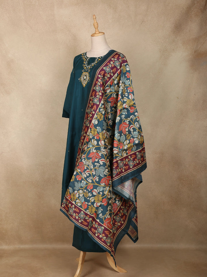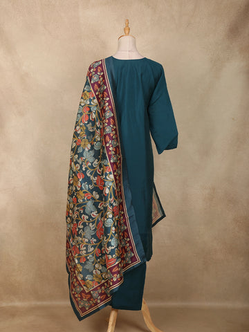 Teal Blue Floral Embroidered Design Cotton Straight Cut Salwar Suit