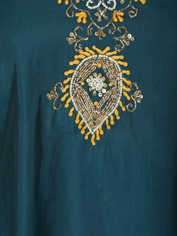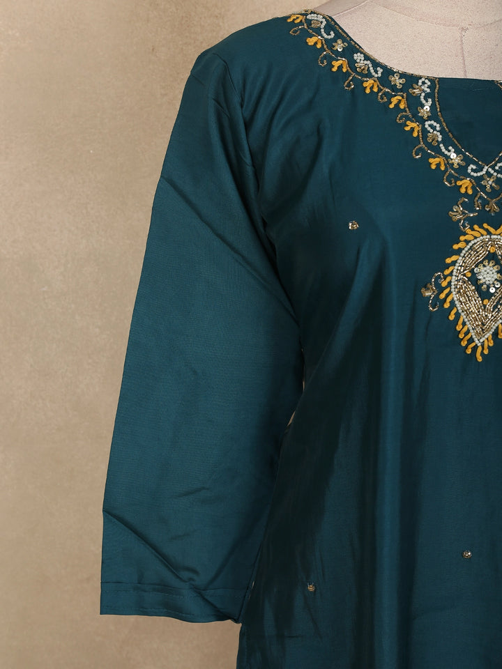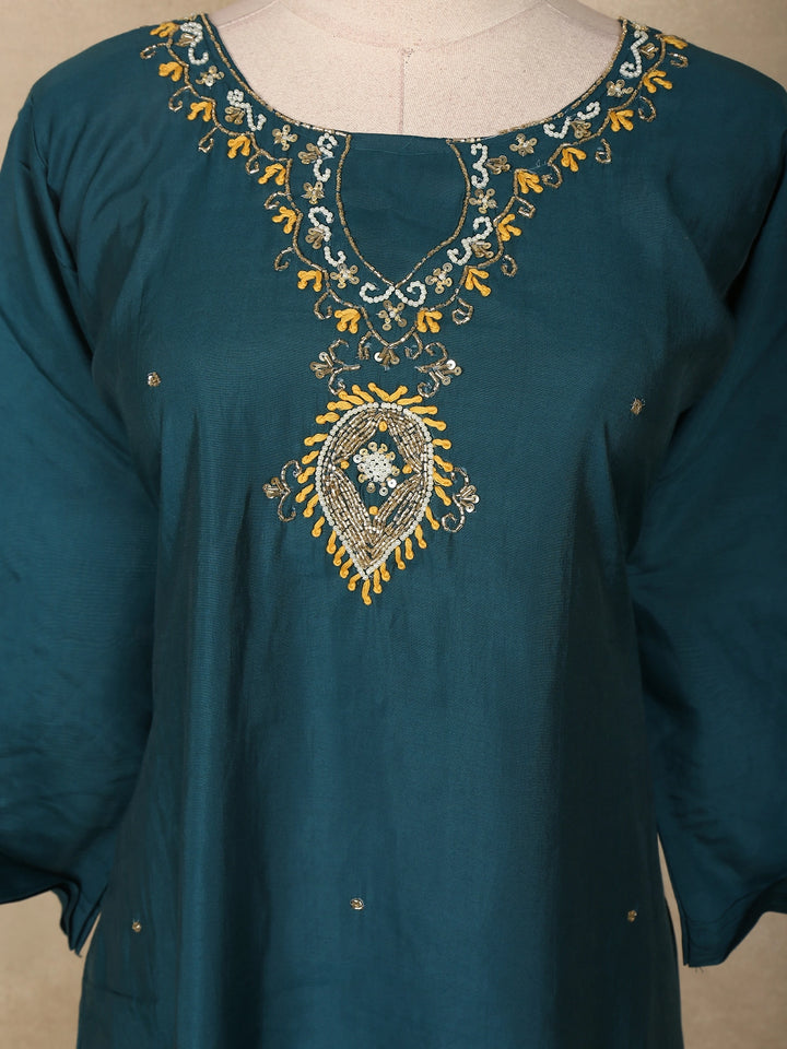Crafted from premium-quality cotton fabric, the ensemble offers unmatched comfort and an elegant drape. The straight-cut kurta features delicate floral embroidery around the neckline, highlighted with intricate bead and thread detailing that gives it a regal touch. The round neckline with keyhole accent and three-quarter sleeves enhance the graceful silhouette while maintaining a contemporary appeal.