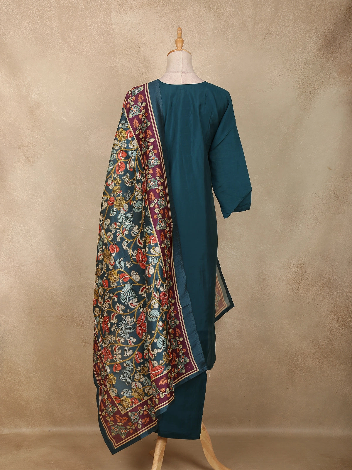 Paired with matching cotton pants and a stunning Kalamkari-printed dupatta, the look radiates ethnic artistry and class. The dupatta stands out with its vibrant floral motifs and rich maroon border, adding a pop of color and traditional vibrance to the outfit. This ensemble is a testament to timeless design that balances comfort, beauty, and culture in every detail.