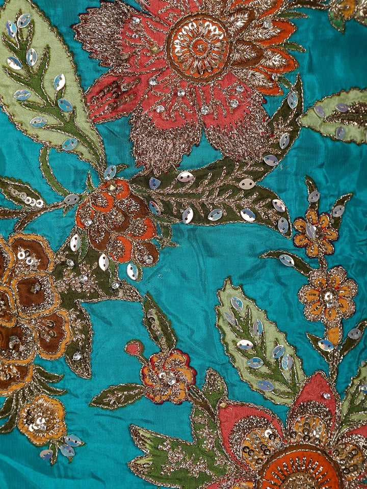 Embrace timeless elegance with this Teal Blue Floral Embroidered Raw Silk Palazzo Suit with Dupatta, a statement ensemble that beautifully blends festive charm with refined craftsmanship. The outfit features a sleeveless V-neck kurta intricately adorned with multi-colored floral thread embroidery, giving it a radiant and eye-catching appeal.