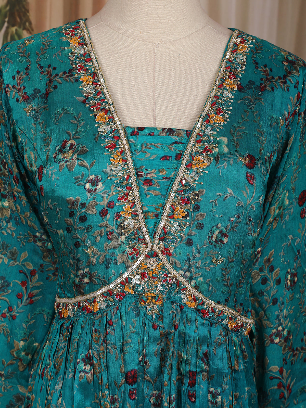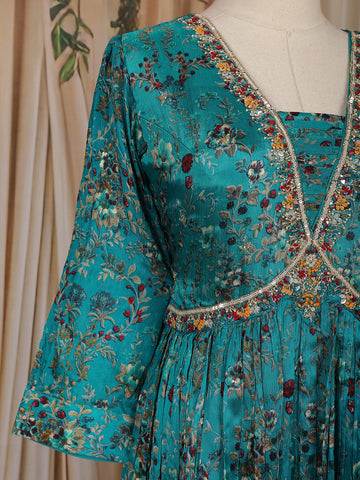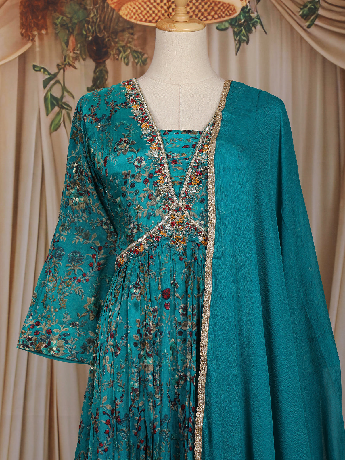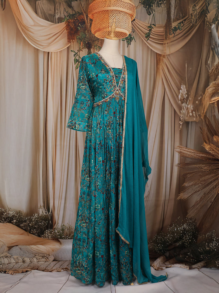 Radiate elegance in this enchanting Teal Blue Floral Embroidered Gown with Dupatta, crafted to make every special occasion unforgettable. This gown features delicate floral embroidery that beautifully highlights the rich teal hue, creating a balance of sophistication and charm. The soft, flowy silhouette in premium chiffon or georgette fabric ensures graceful movement, while the embroidery adds a festive touch of glamour.