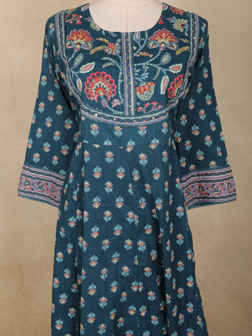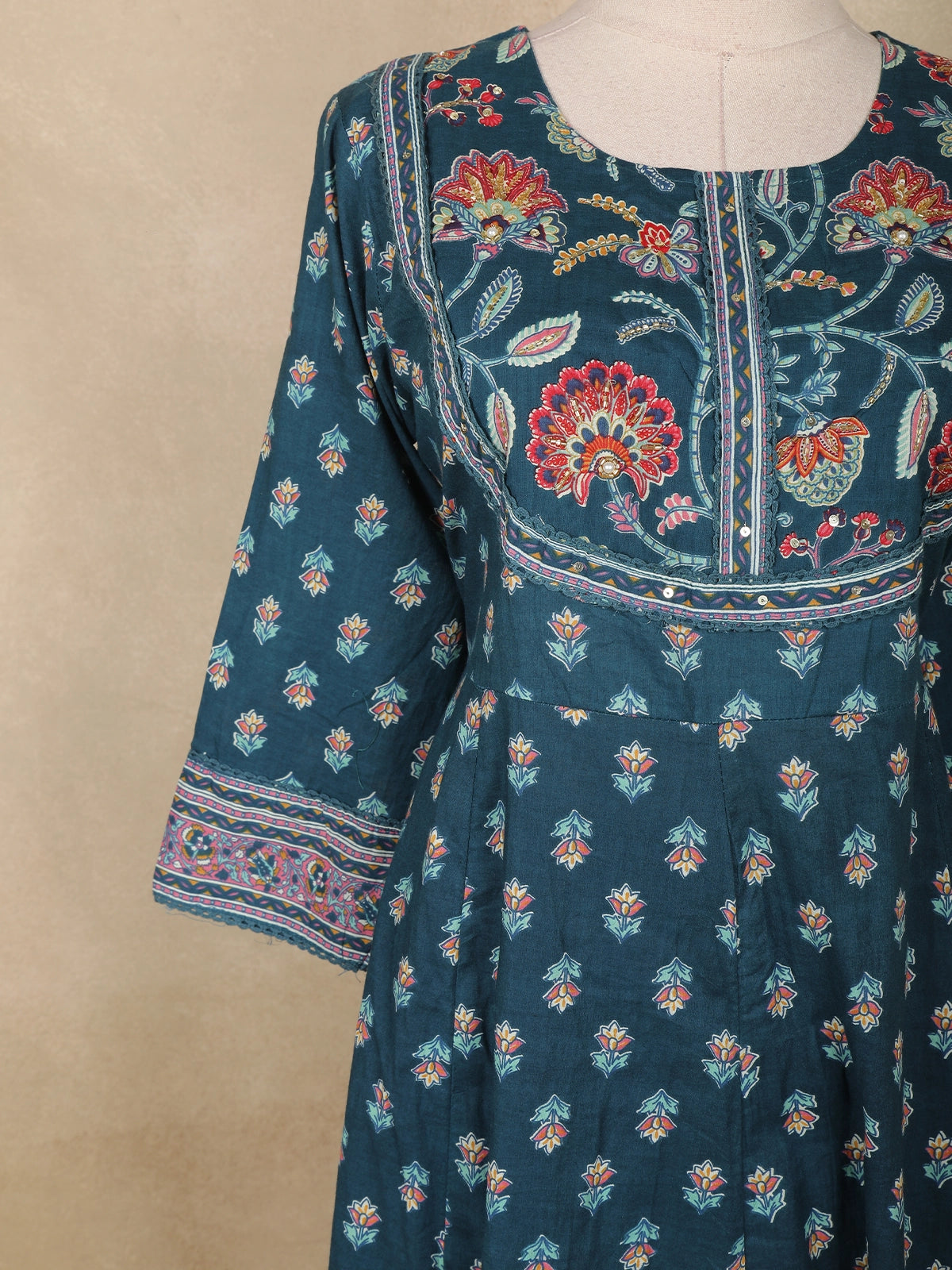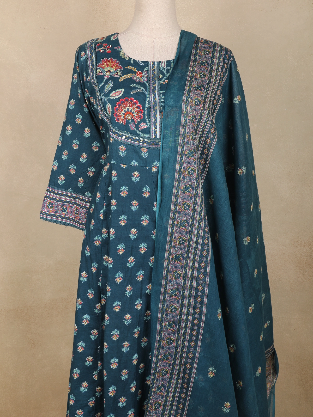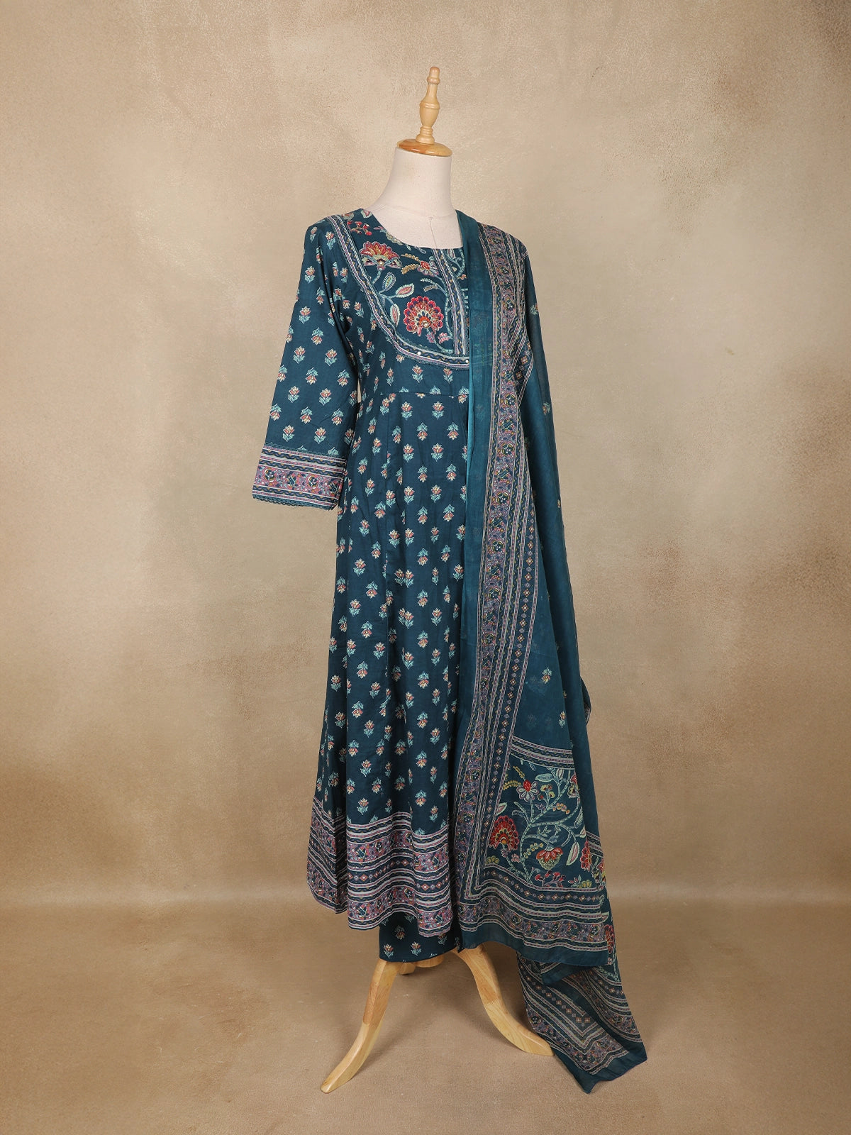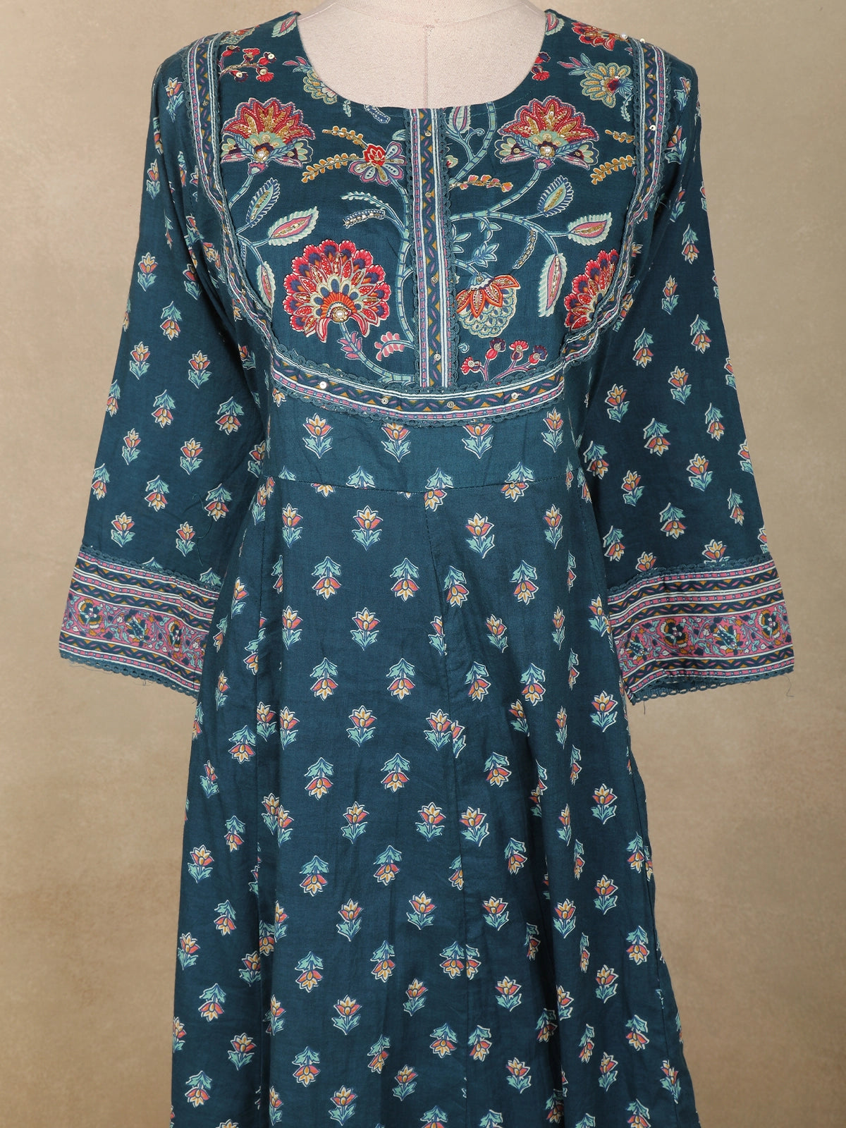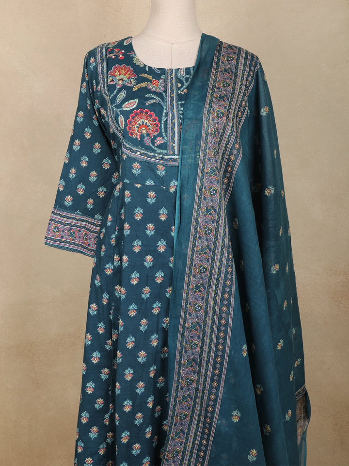 Teal Blue Floral Printed Design Cotton Anarkali Salwar Suit
