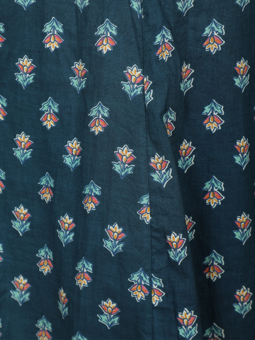 The kurta features a teal blue base adorned with intricate floral butti prints, giving it a refined ethnic appeal. The beautifully designed yoke steals the spotlight with its vibrant multicolored floral motifs and patterned panel detailing, enhancing the neckline and adding a handcrafted charm. Gentle gathers at the waist flow into a flattering flare, offering a fluid and comfortable drape.