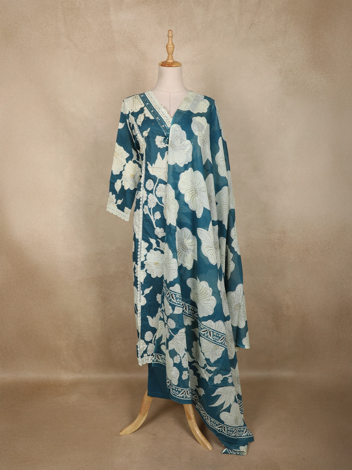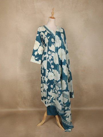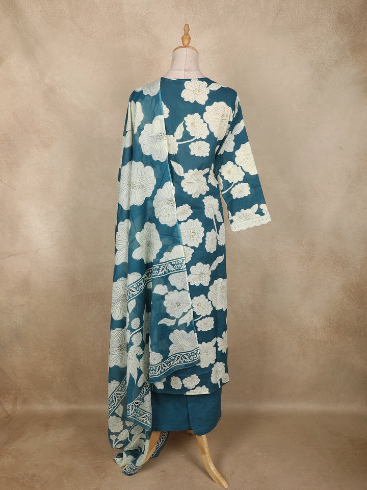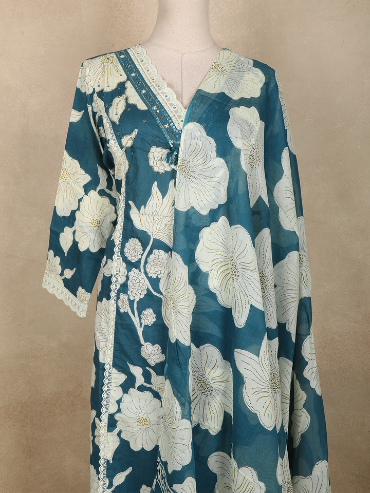 Teal Blue Floral Printed Design Cotton Anarkali Salwar Suit with Dupatta