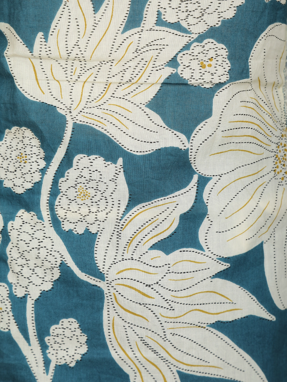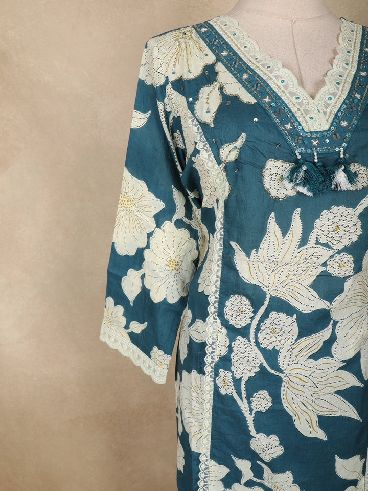 Embrace fresh, breezy elegance with this stunning Teal Blue Floral Printed Cotton Anarkali Salwar Suit, designed for women who love effortless style with a touch of grace. The Anarkali kurta features large ivory floral motifs that beautifully contrast against the rich teal blue base, creating a striking and artistic visual appeal. The natural flare of the Anarkali silhouette adds fluidity and movement, making it perfect for both everyday wear and semi-festive occasions.