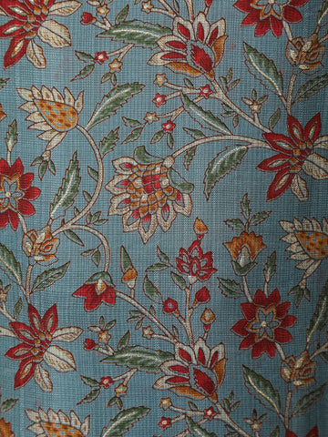 The teal blue base is beautifully accentuated with floral and traditional printed motifs, lending a graceful ethnic appeal. The V-neckline and 3/4 sleeves add a refined touch, while the straight-cut silhouette offers a flattering fit that complements all body types.