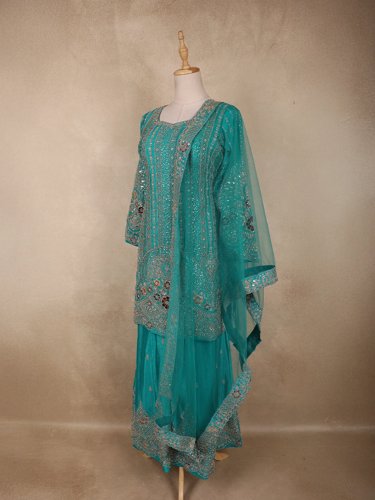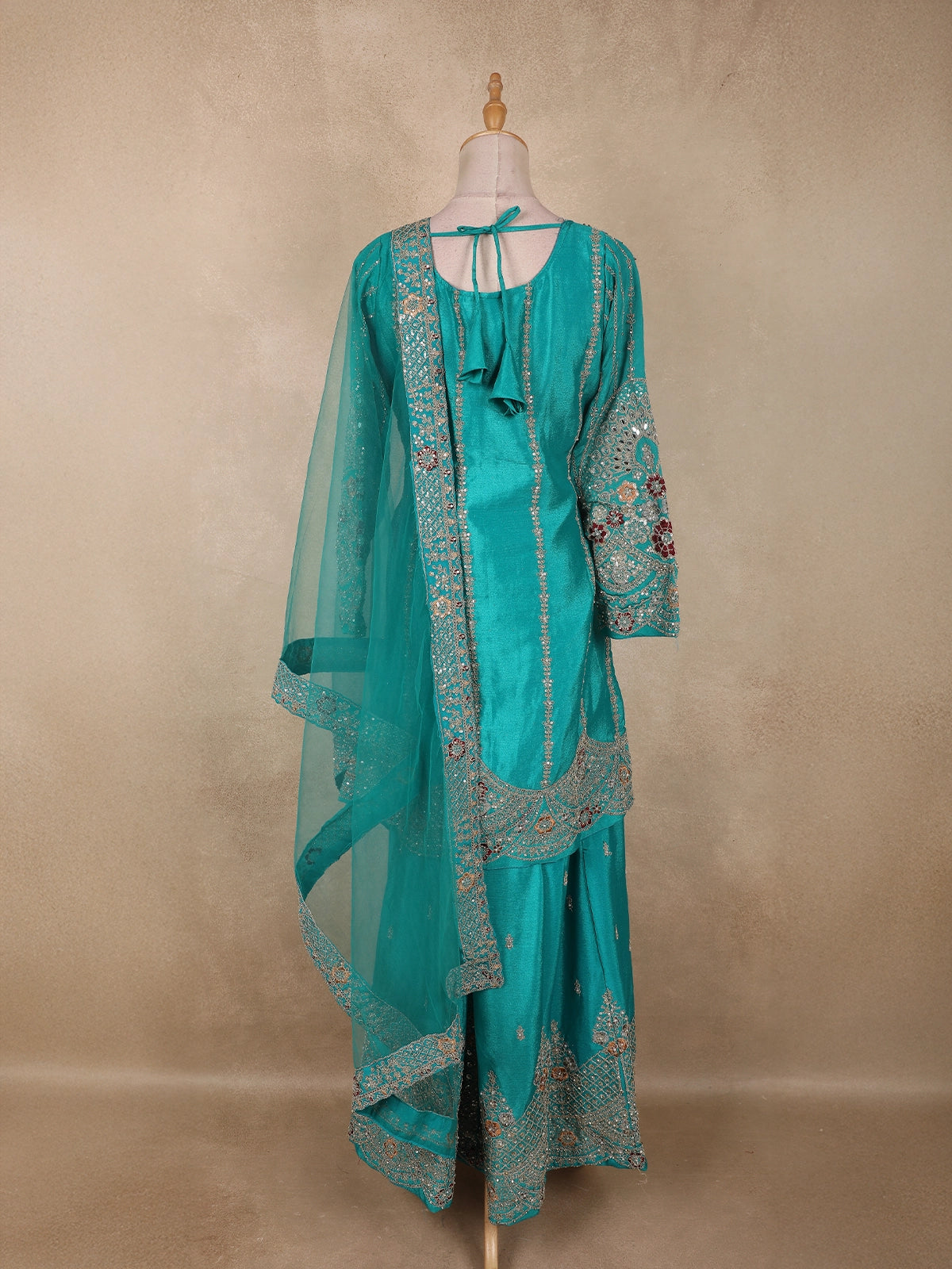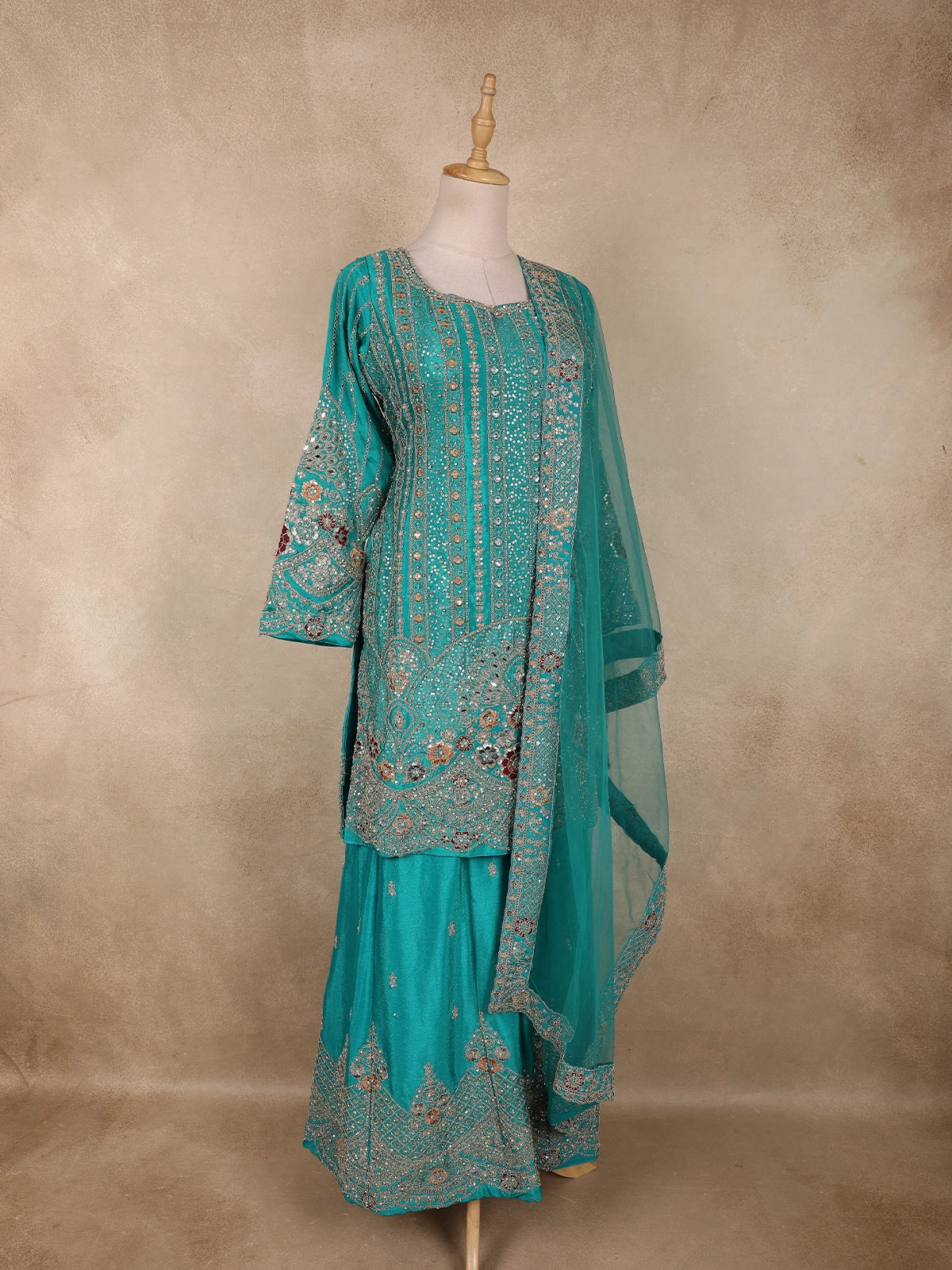Teal Blue Floral Sequins and Thread Embroidered Design Georgette Palazzo Suit