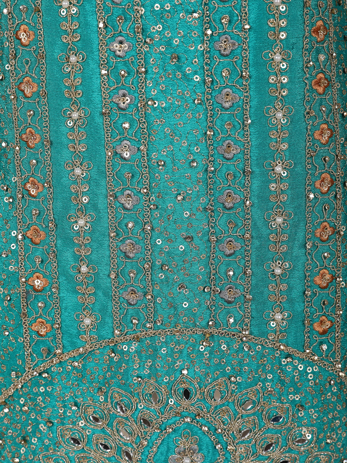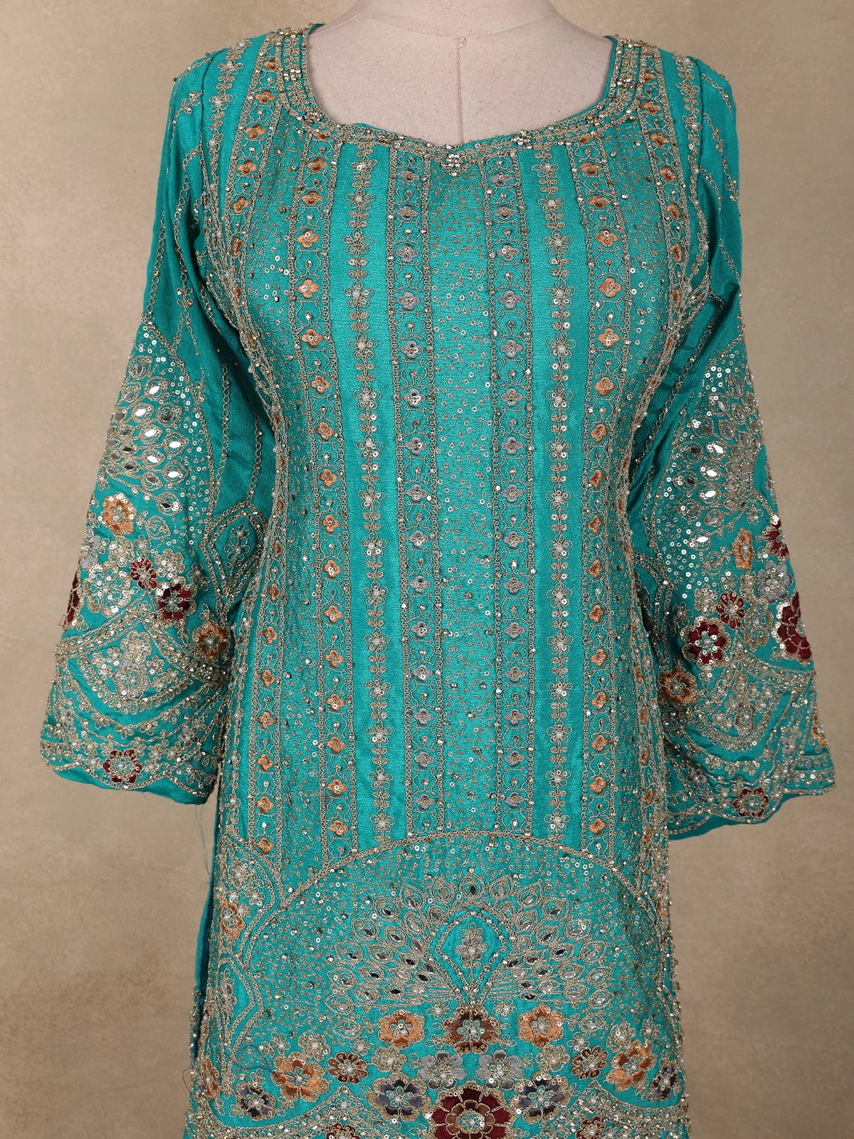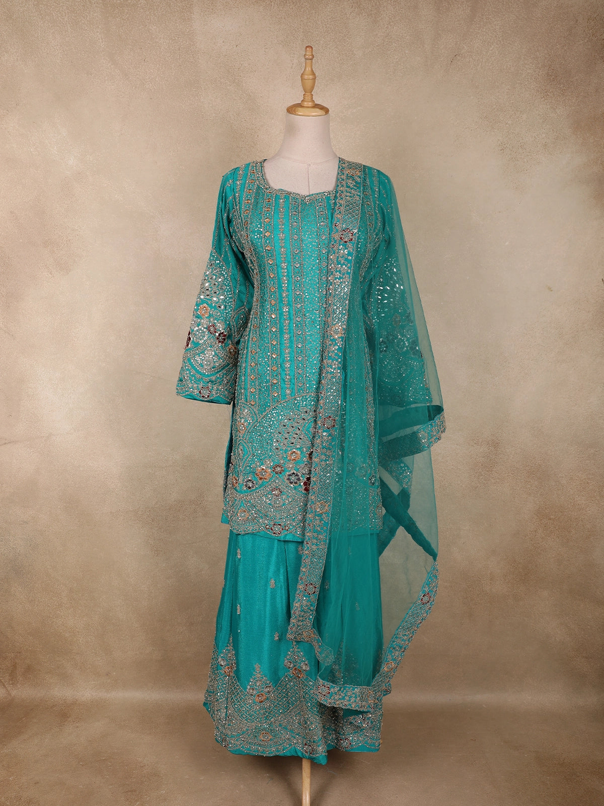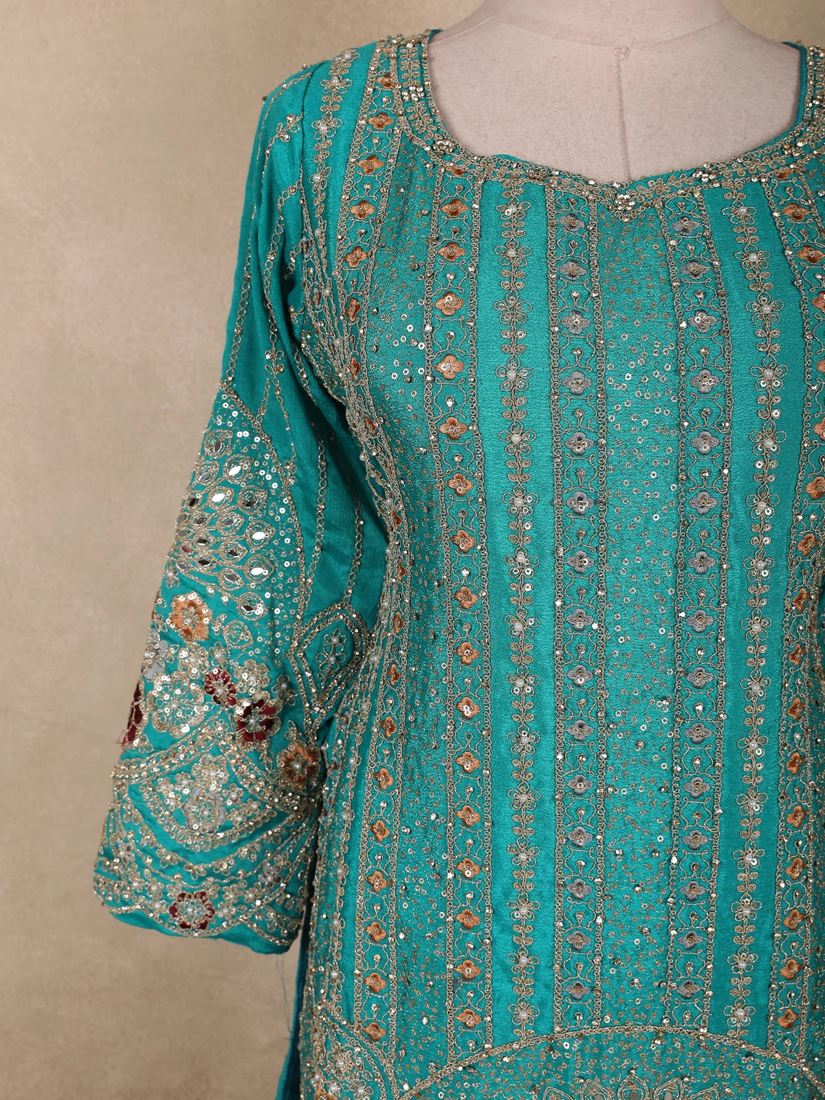 Teal Blue Floral Sequins and Thread Embroidered Design Georgette Palazzo Suit