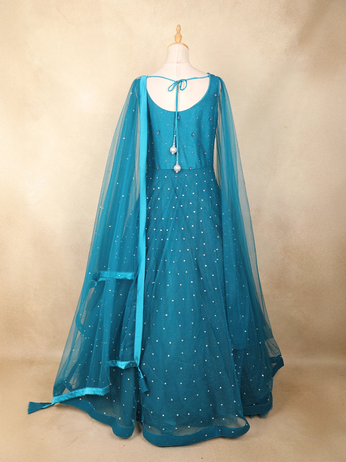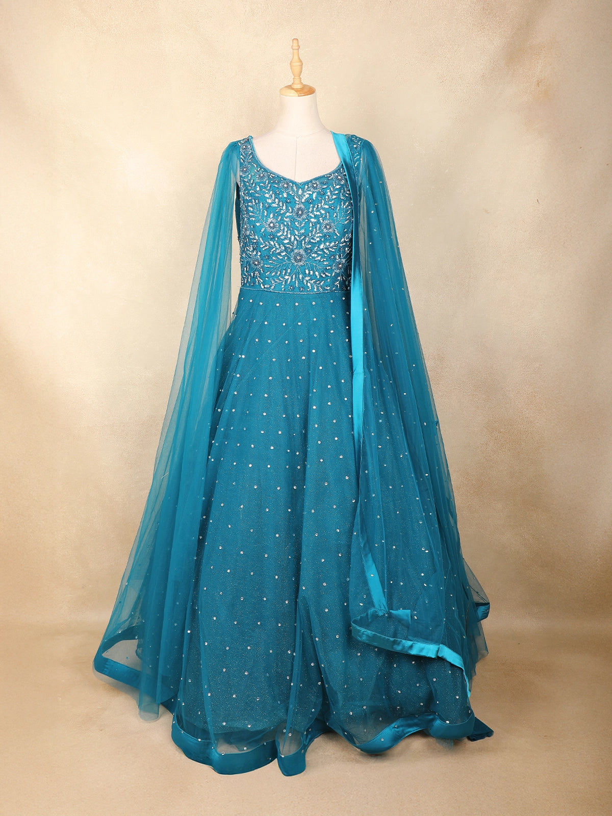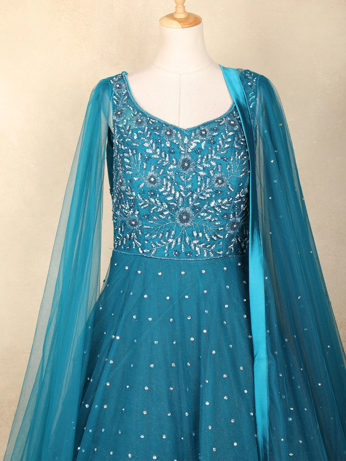 Teal Blue Floral Sequins Embroidered Net Gown with Dupatta