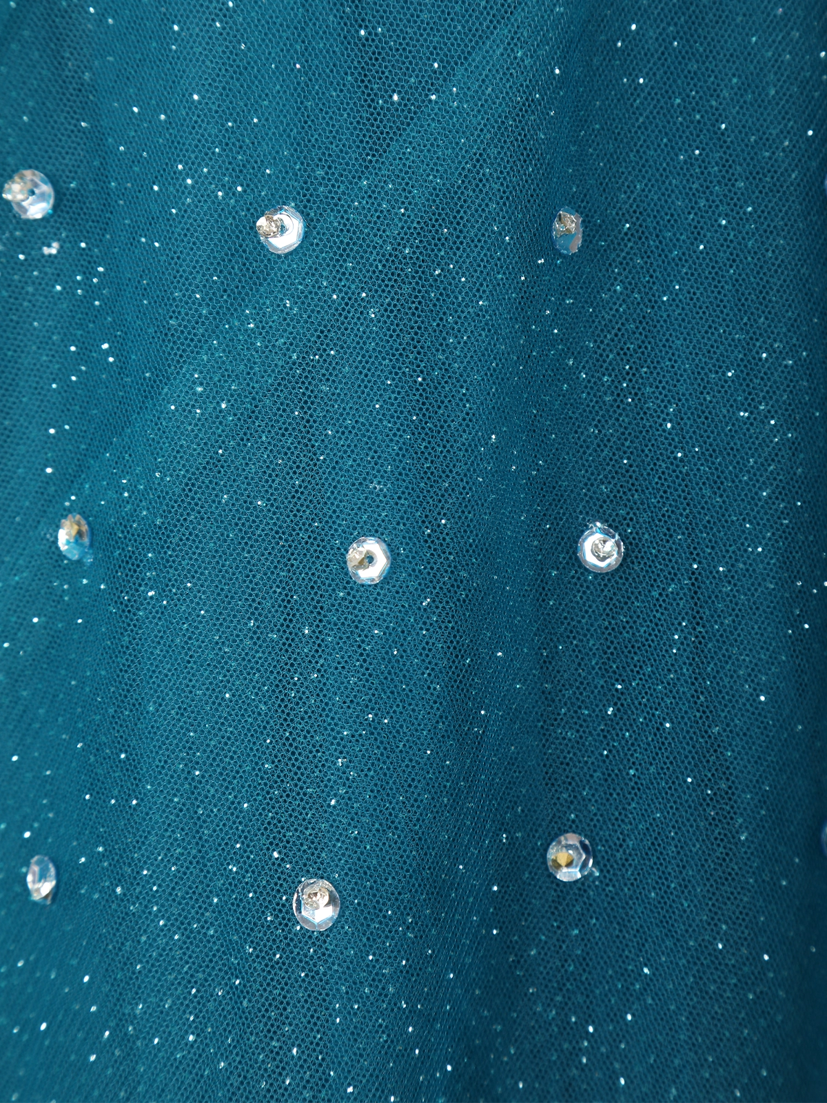 This Teal Blue Net Gown brings a refreshing glamour to any special occasion. The bodice is richly adorned with intricate floral sequin embroidery arranged in radiant patterns that shine and sparkle beautifully under the lights. The sweetheart neckline enhances the feminine appeal with a sophisticated touch.