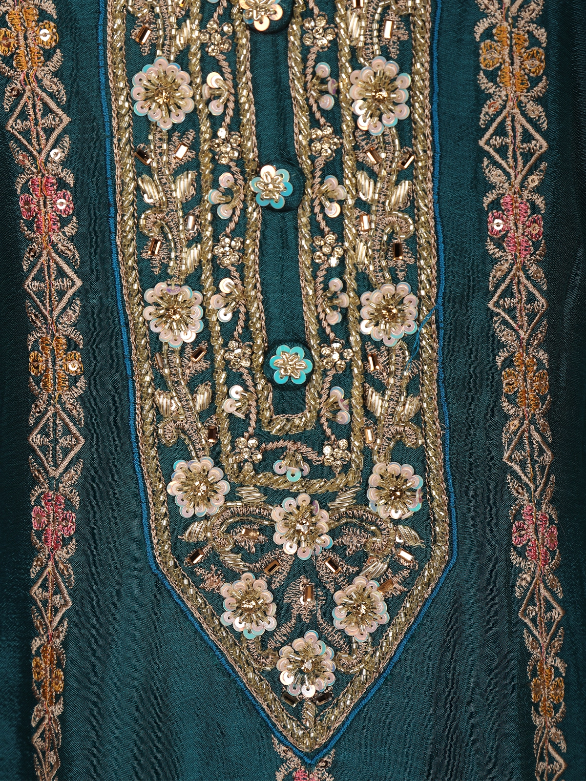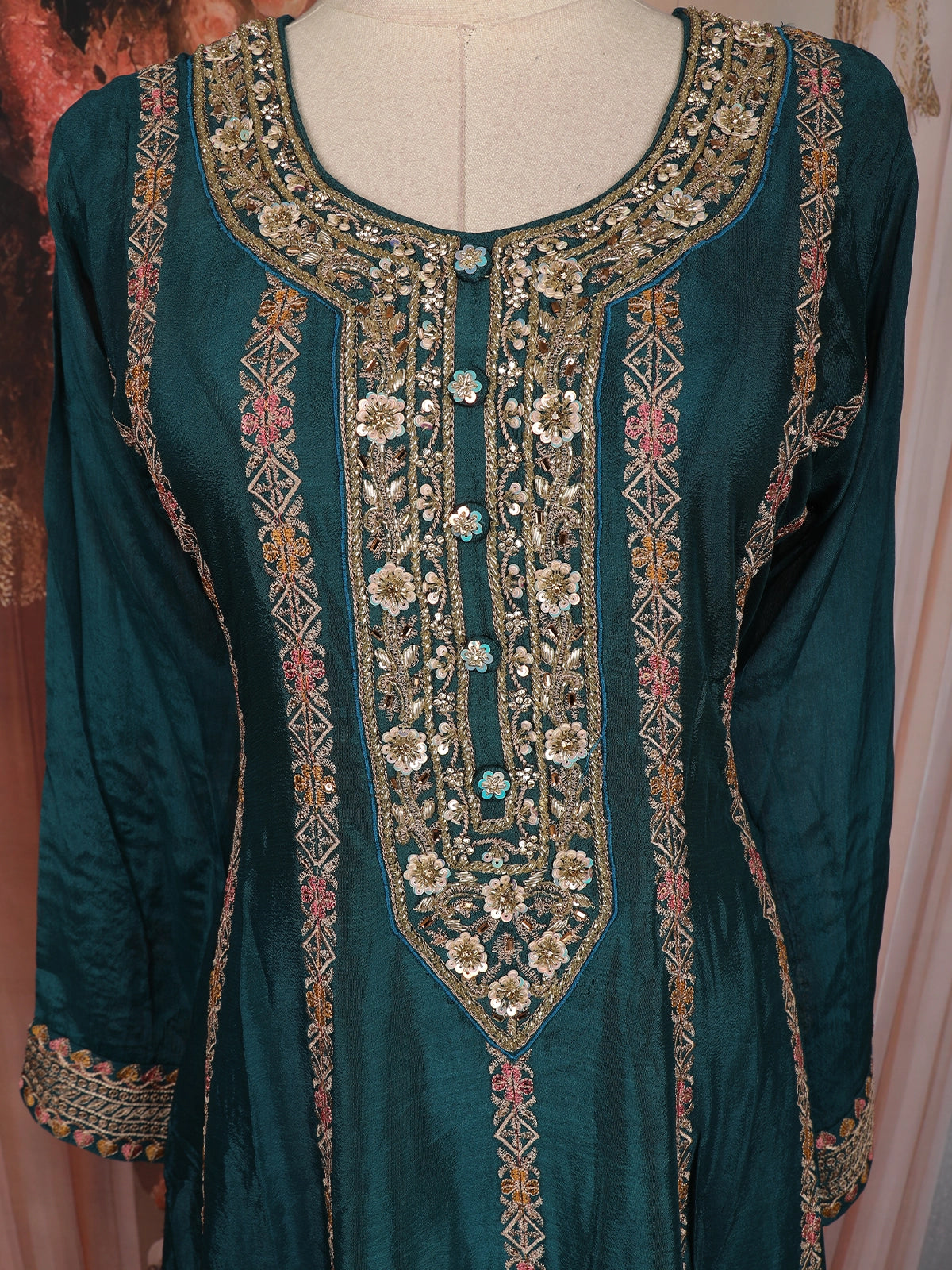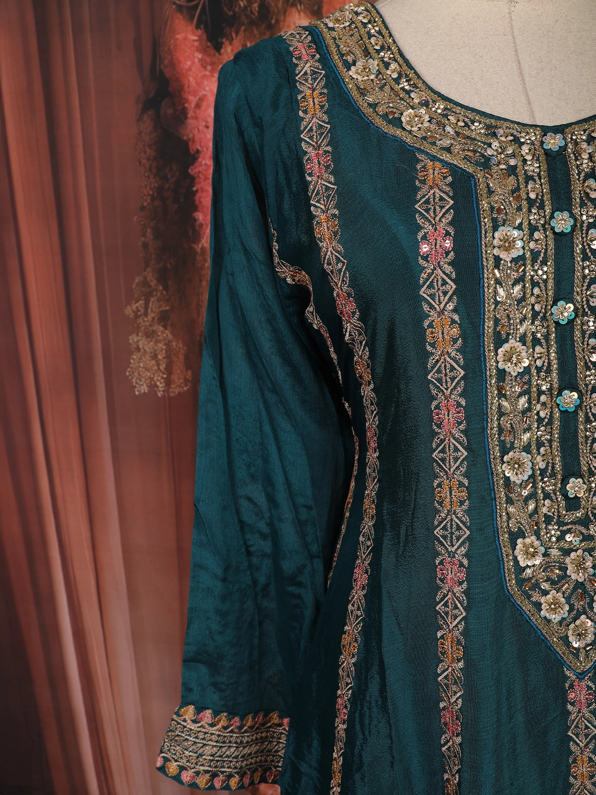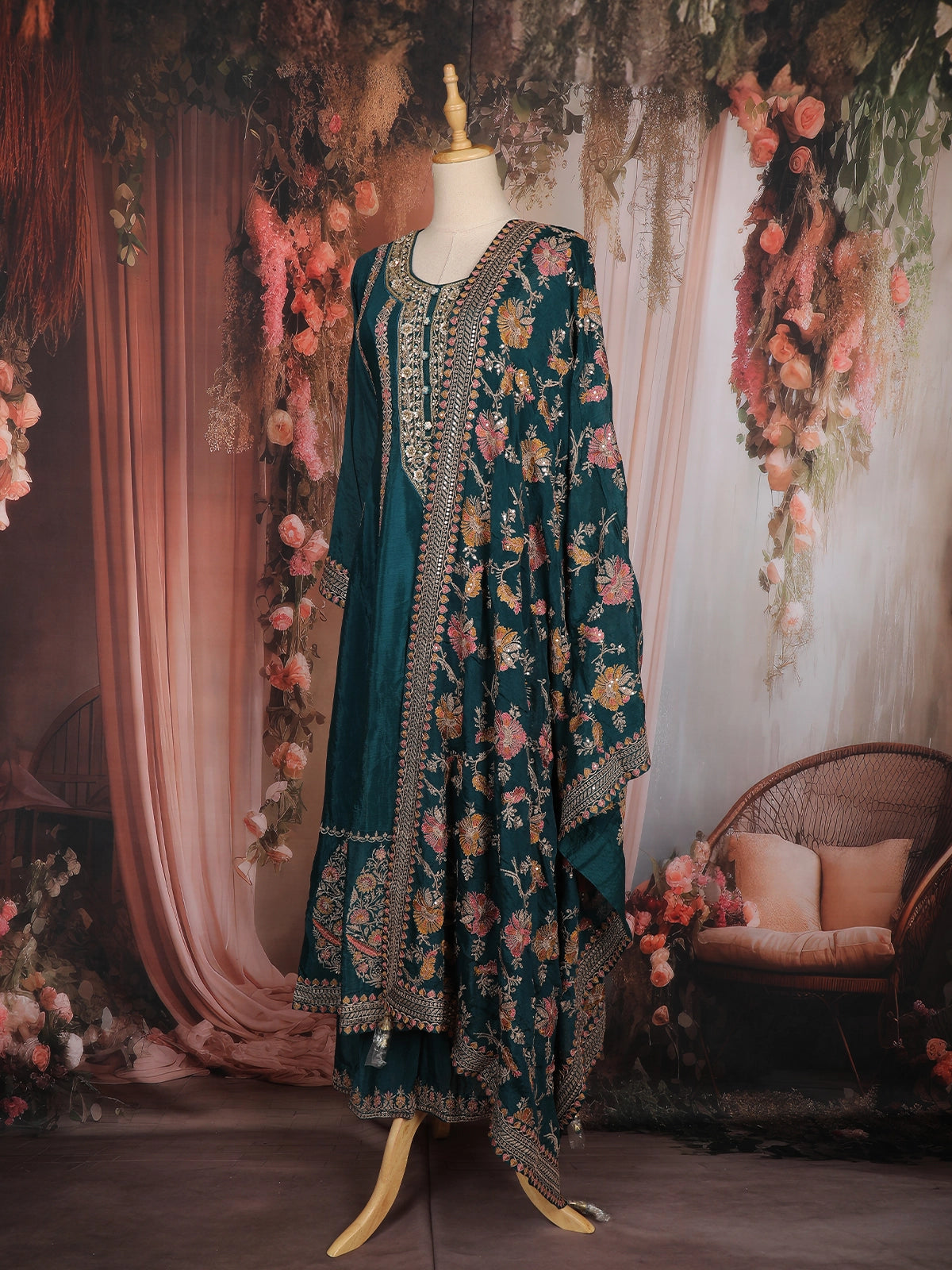 Teal Blue Floral Thread and Sequins Embroidered Design Crepe Palazzo Suit
