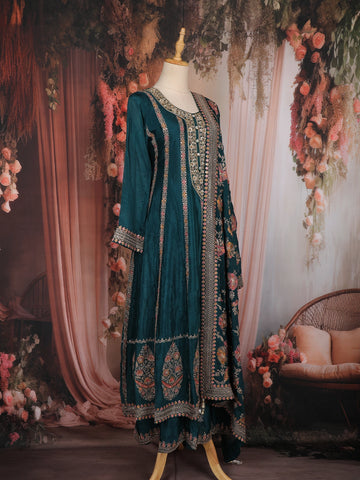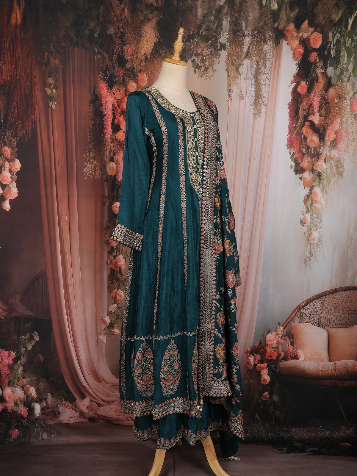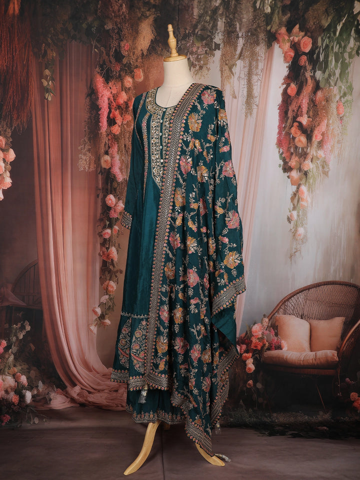 Step into effortless elegance with this Teal Blue Floral Thread and Sequins Embroidered Crepe Palazzo Suit, a beautifully crafted ensemble designed to exude charm and sophistication. The deep teal blue shade brings a rich, regal allure, making it perfect for both daytime festivities and evening celebrations.