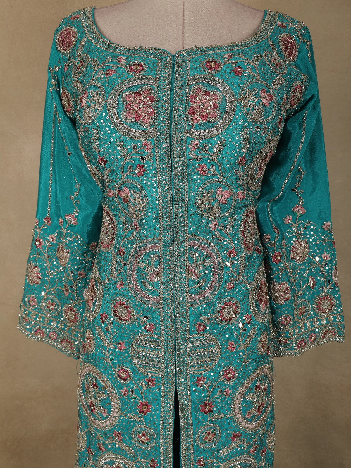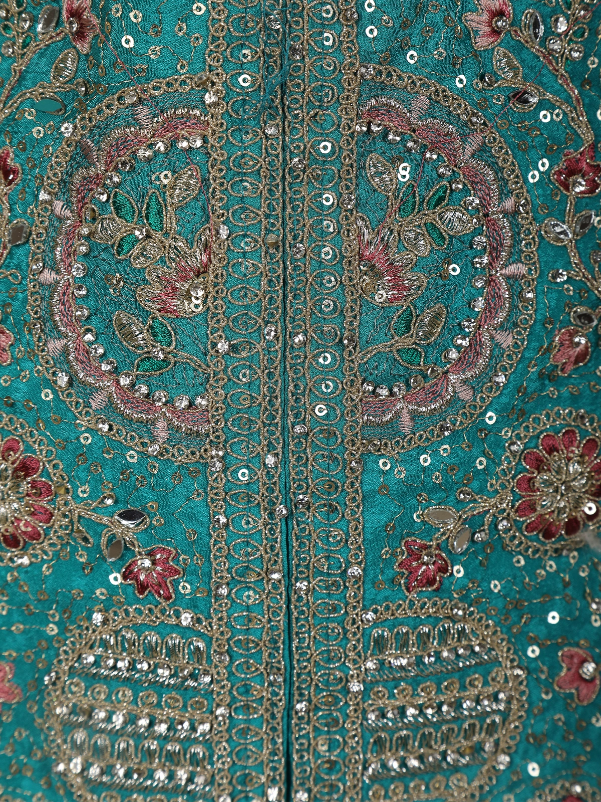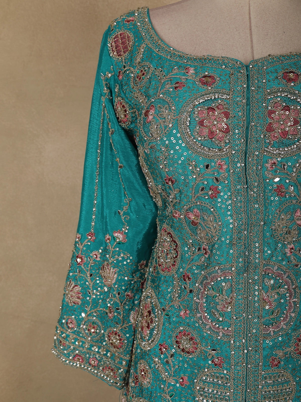 Perfect for wedding functions, receptions, festive celebrations, and special occasions, this teal blue lehenga is an ideal choice for those who appreciate classic embroidery with a contemporary touch. A statement ensemble that promises elegance, comfort, and timeless charm.