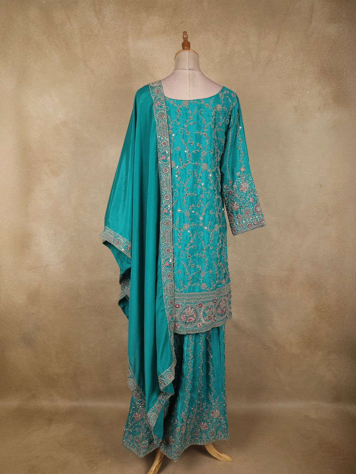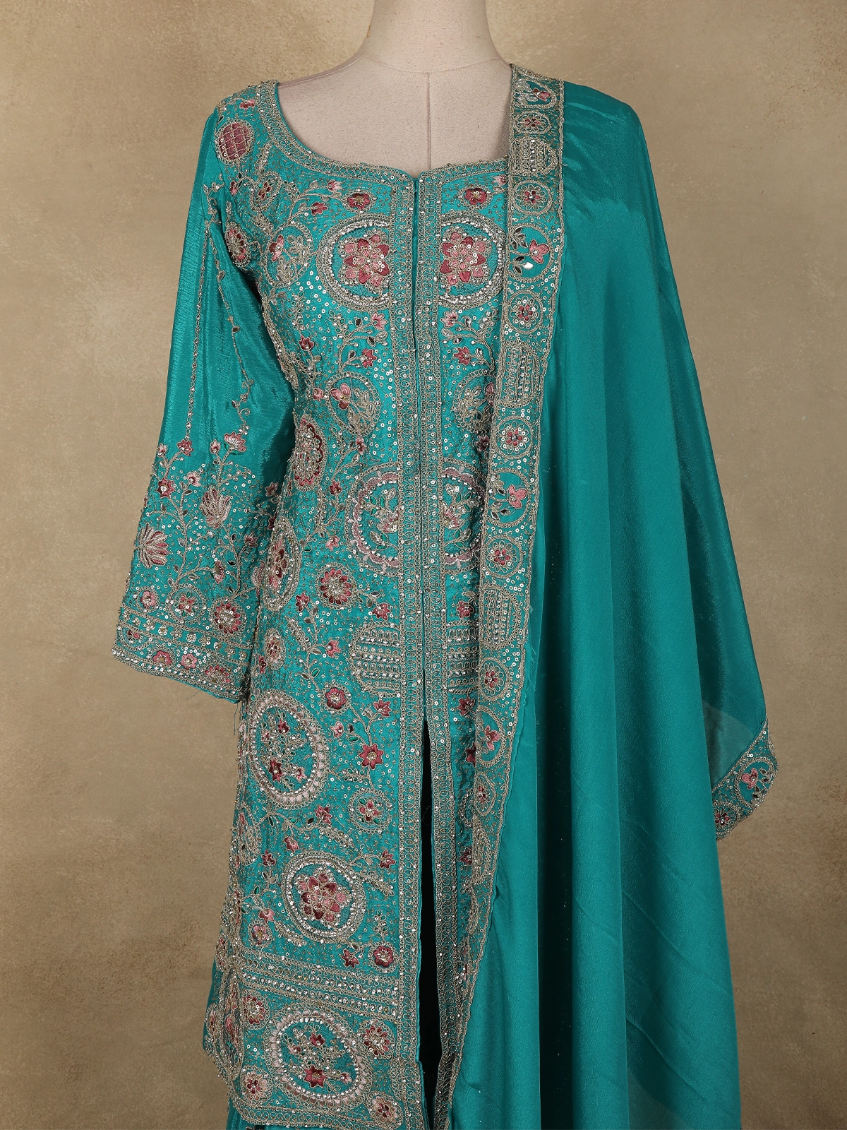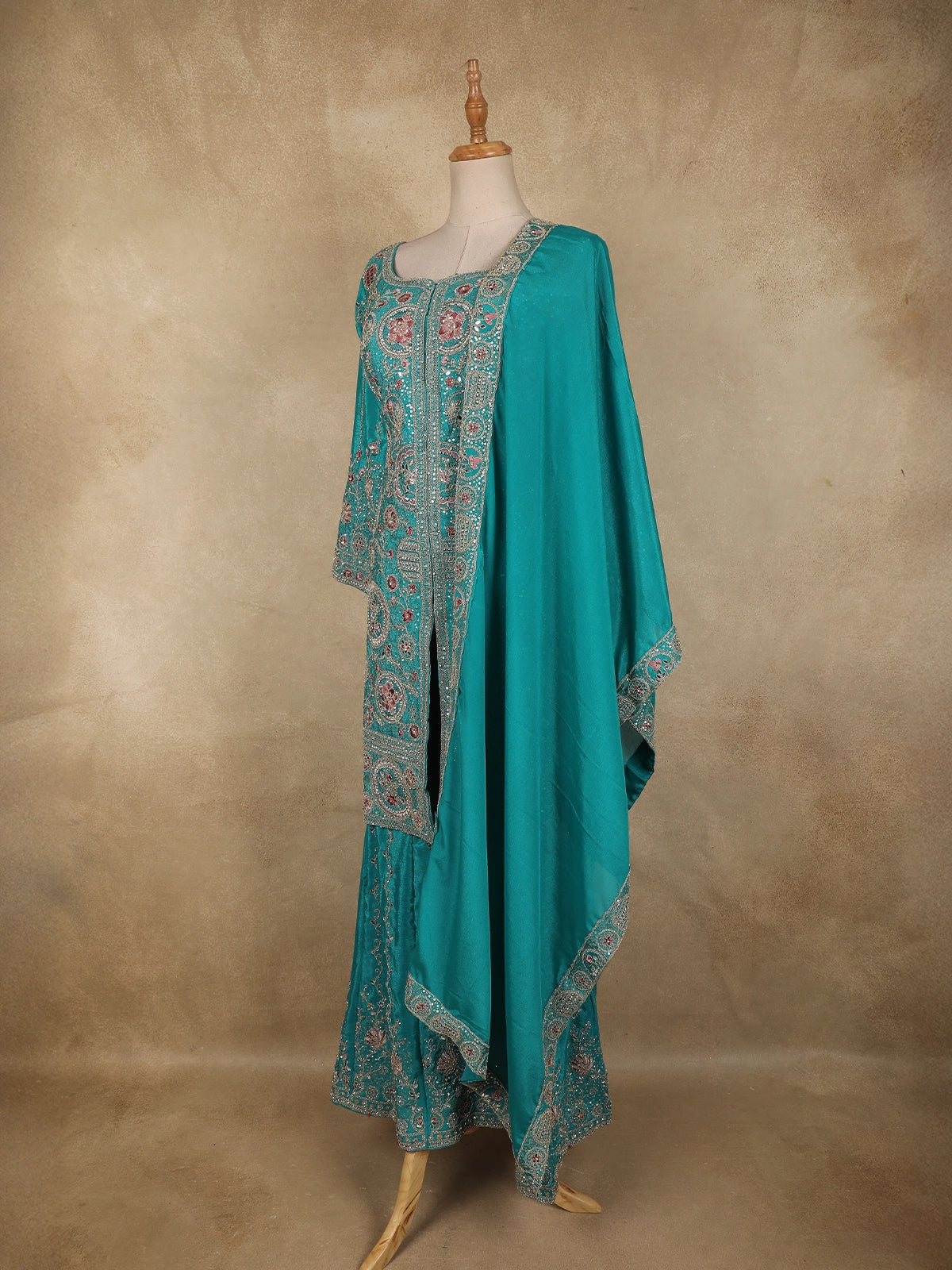 Perfect for wedding functions, receptions, festive celebrations, and special occasions, this teal blue lehenga is an ideal choice for those who appreciate classic embroidery with a contemporary touch. A statement ensemble that promises elegance, comfort, and timeless charm.