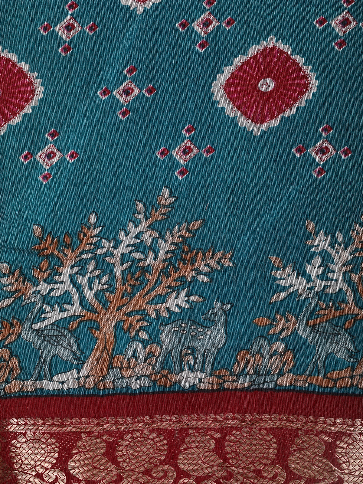 Teal Blue Geometric Printed Design Chanderi Cotton Saree with Contrast Zari Woven Border