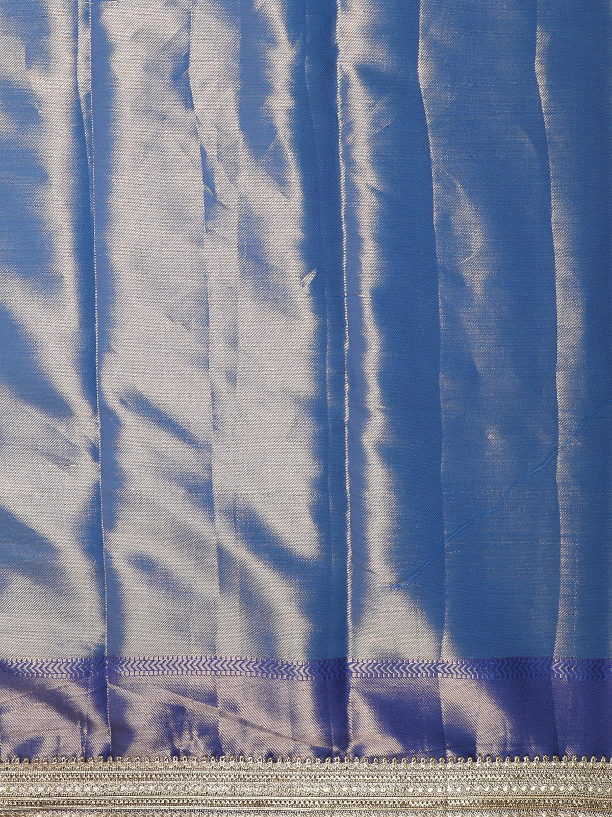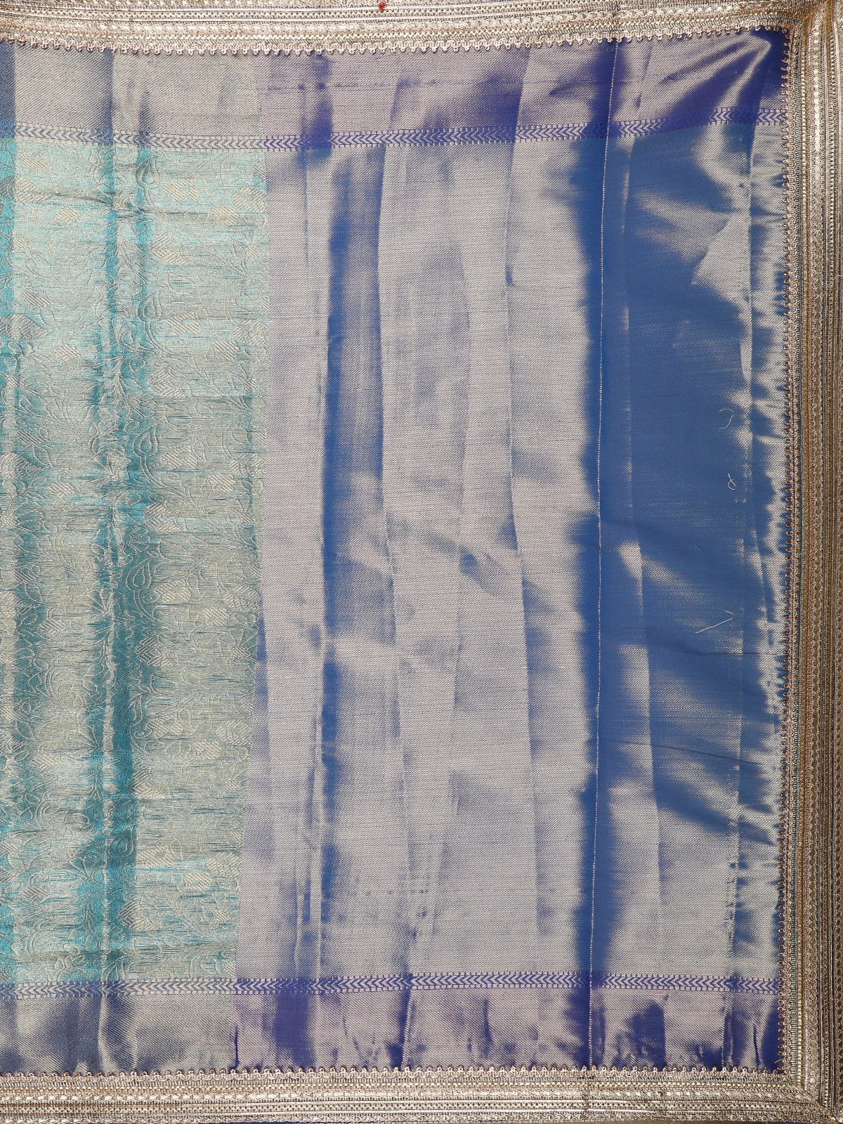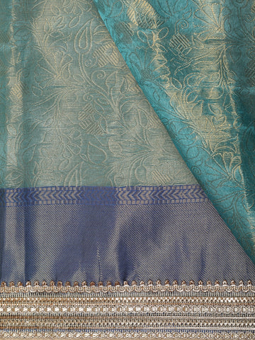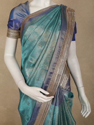 Teal Blue Geometric Zari Woven Design Tissue Designer Saree with Sequins Border