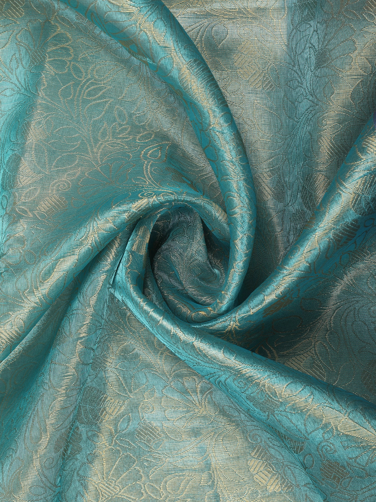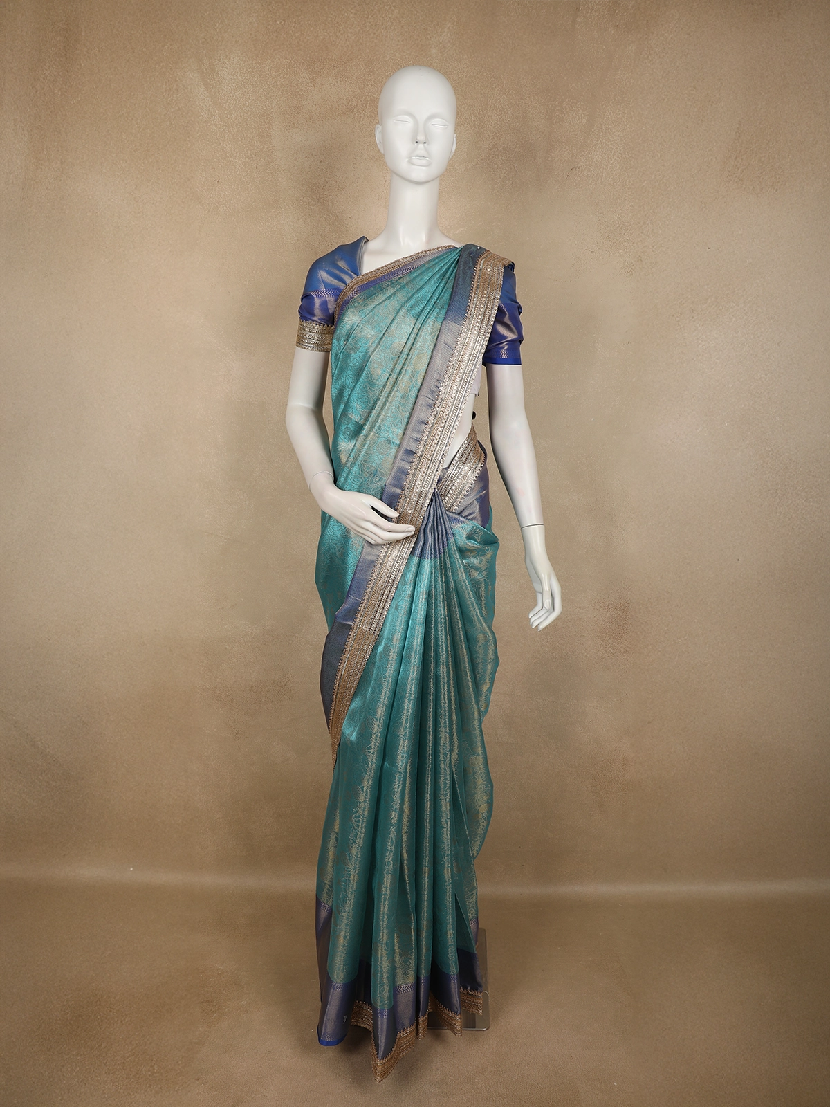 The soothing teal blue hue, paired with contrasting zari highlights, creates a timeless appeal that flatters across occasions—from festive celebrations and receptions to elegant evening events. Lightweight yet rich in appearance, this saree drapes effortlessly, offering comfort alongside sophistication. Style it with statement jewellery to complete a look that speaks of understated glamour and refined craftsmanship.