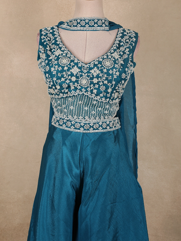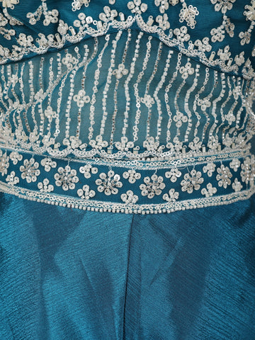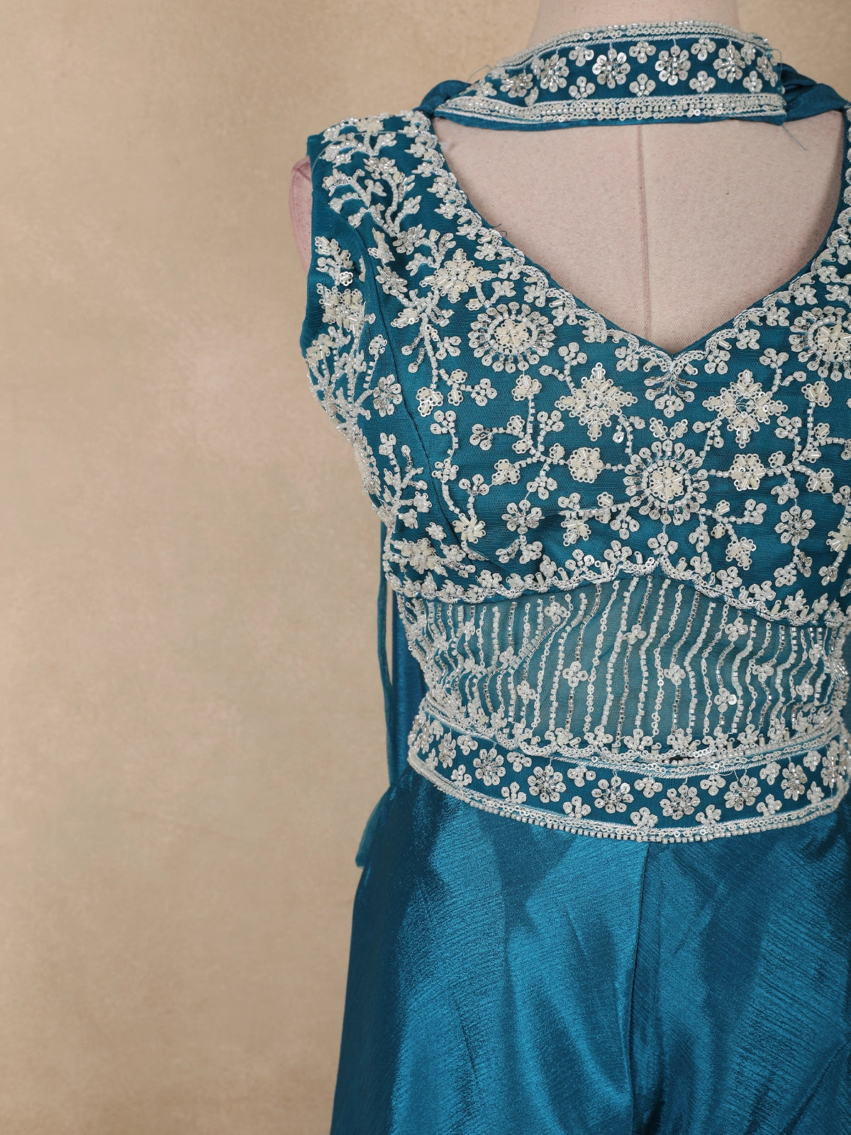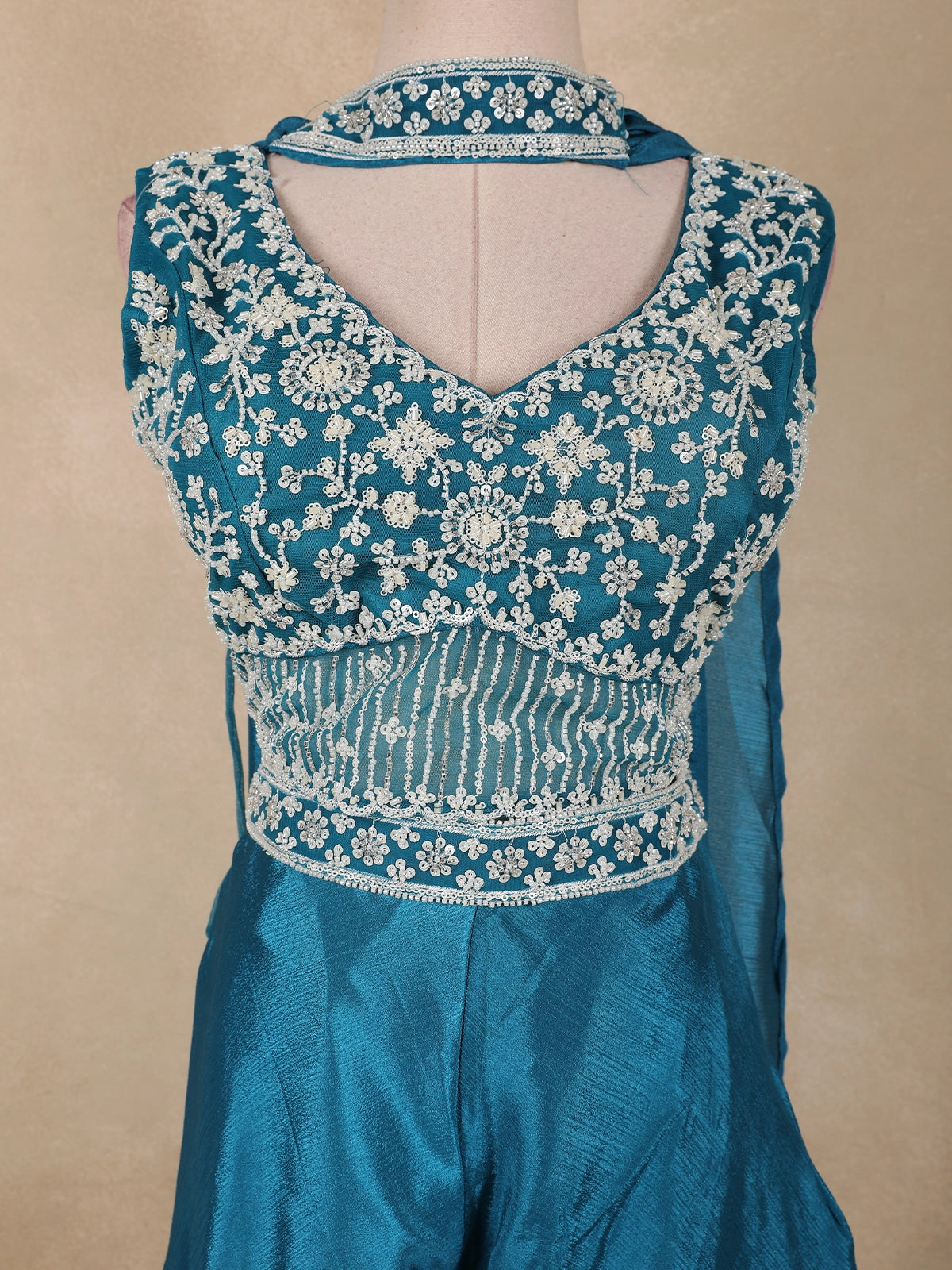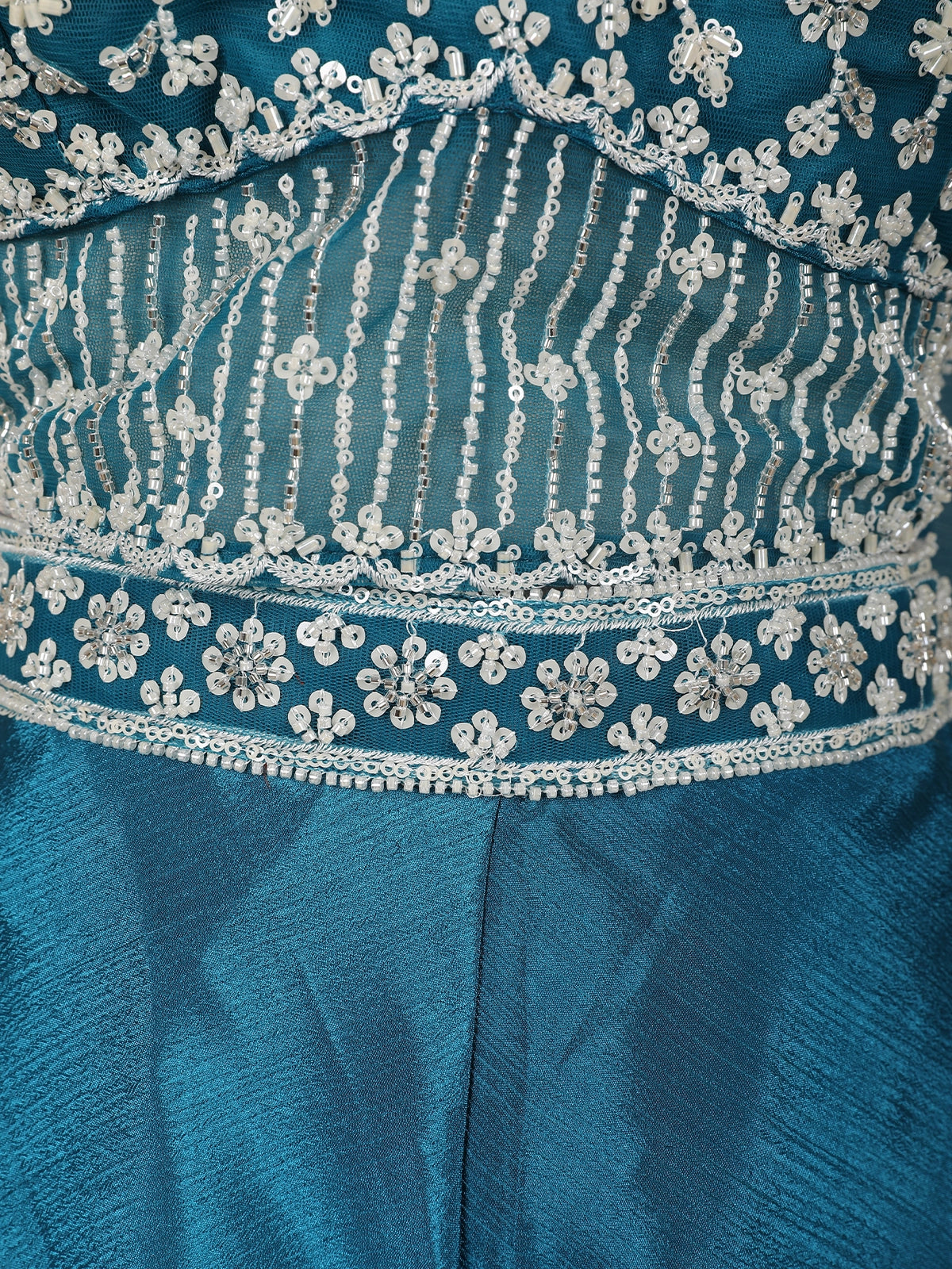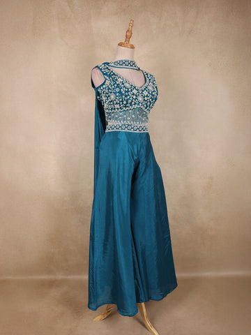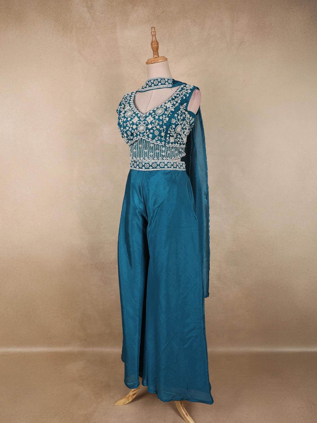 Radiating elegance in a vibrant Teal Blue hue, this stunning georgette palazzo suit is crafted to make a bold yet graceful statement. The ensemble features a beautifully designed cropped kurta-style top, richly adorned with heavy sequins and bead embroidery that form intricate floral patterns across the bodice. The dense embellishment adds a luxurious sparkle, perfectly suited for festive and celebratory occasions.