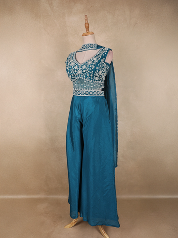 Teal Blue Heavy Sequins and Beads Embroidered Design Georgette Palazzo Suit with Dupatta