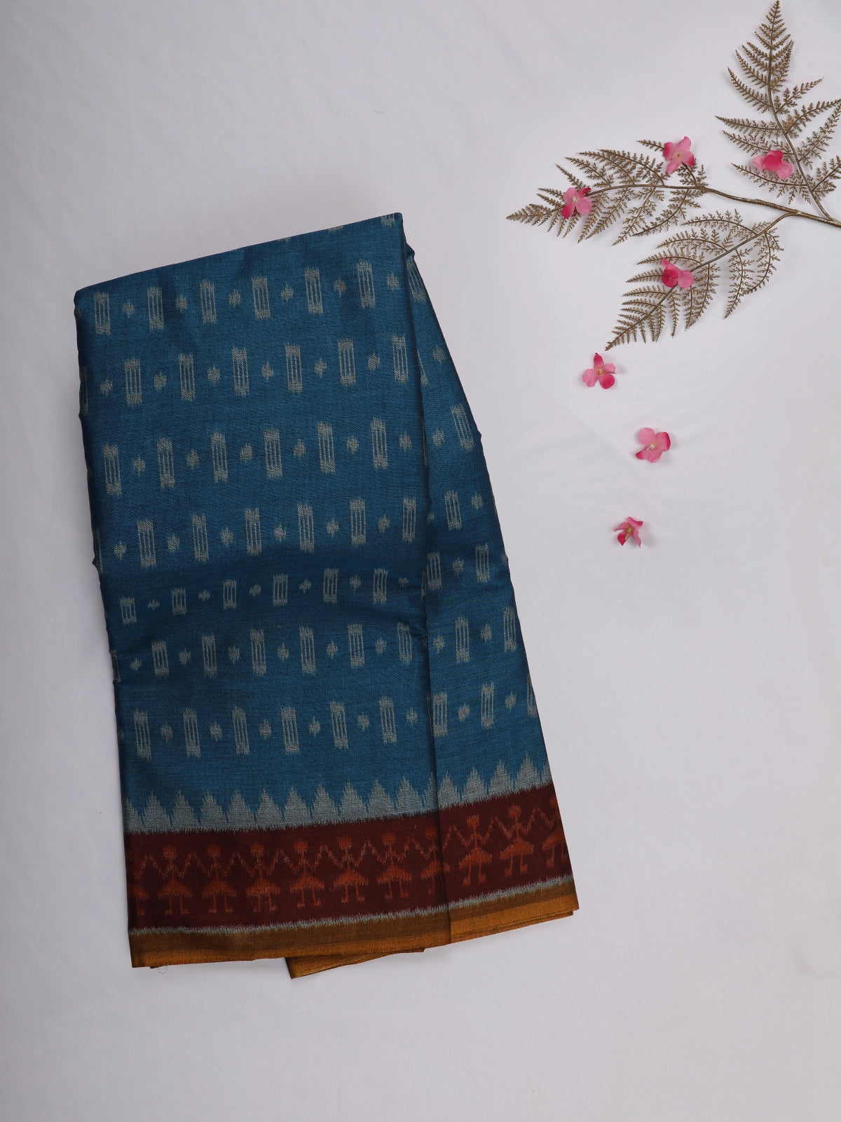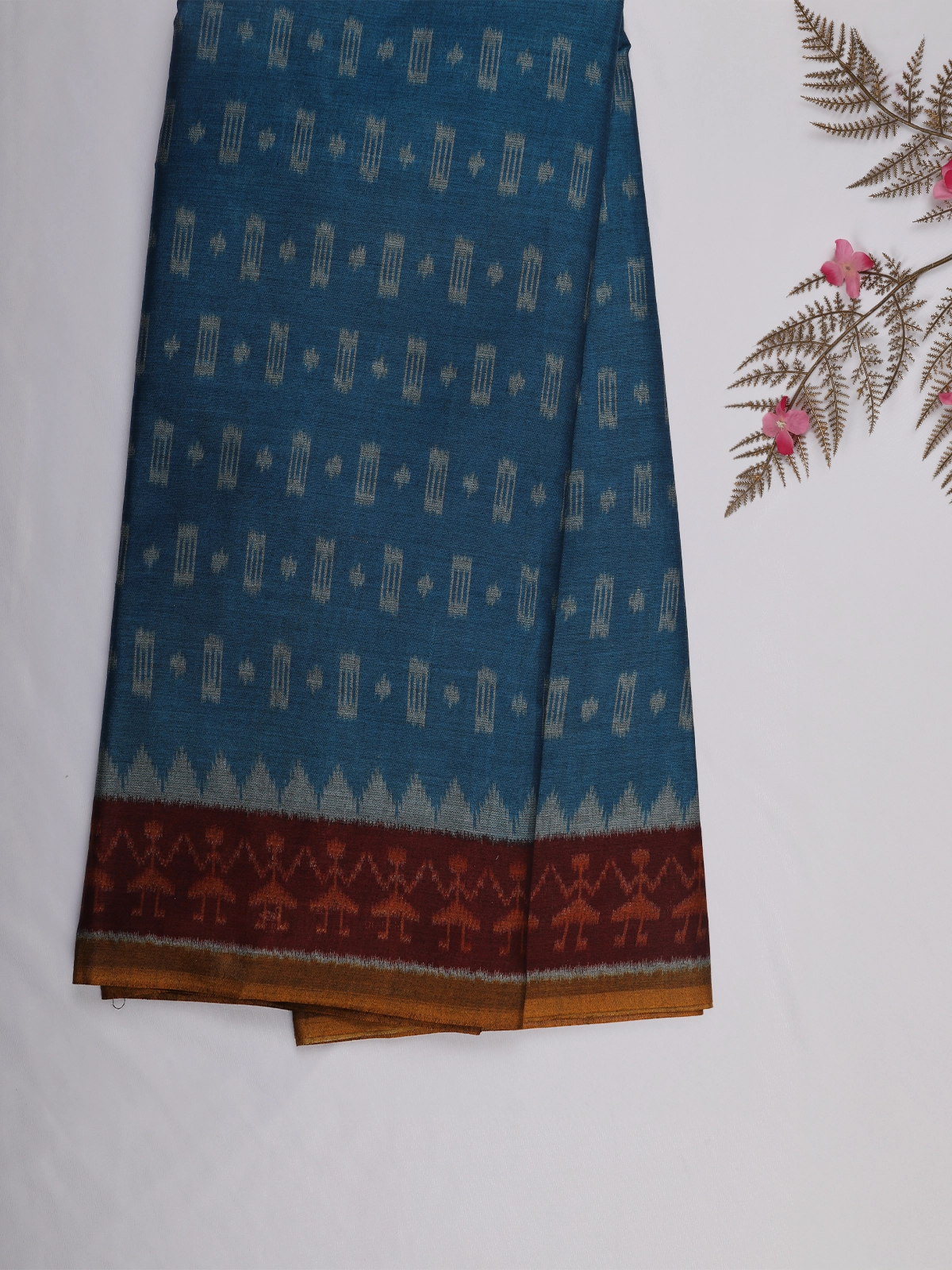 Teal Blue Ikat Printed Karishma Cotton Saree with Contrast Maroon Border