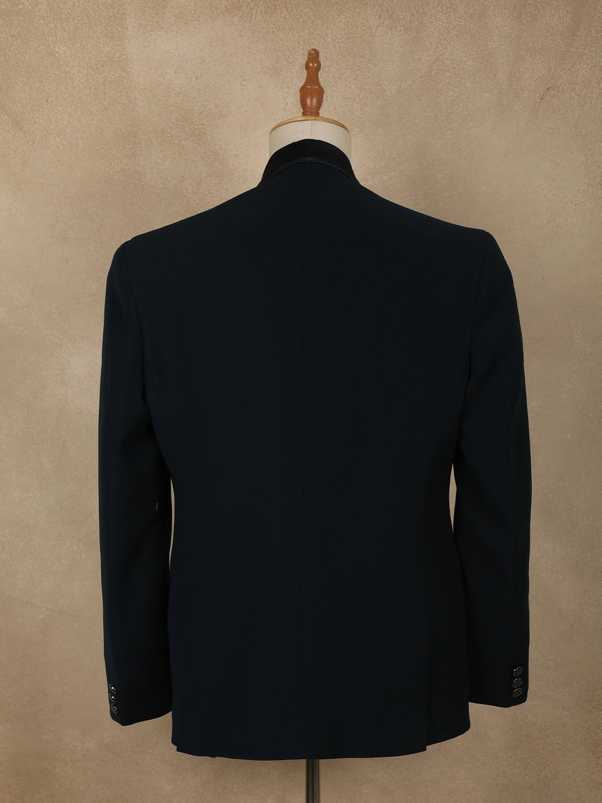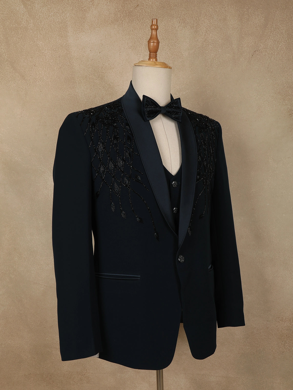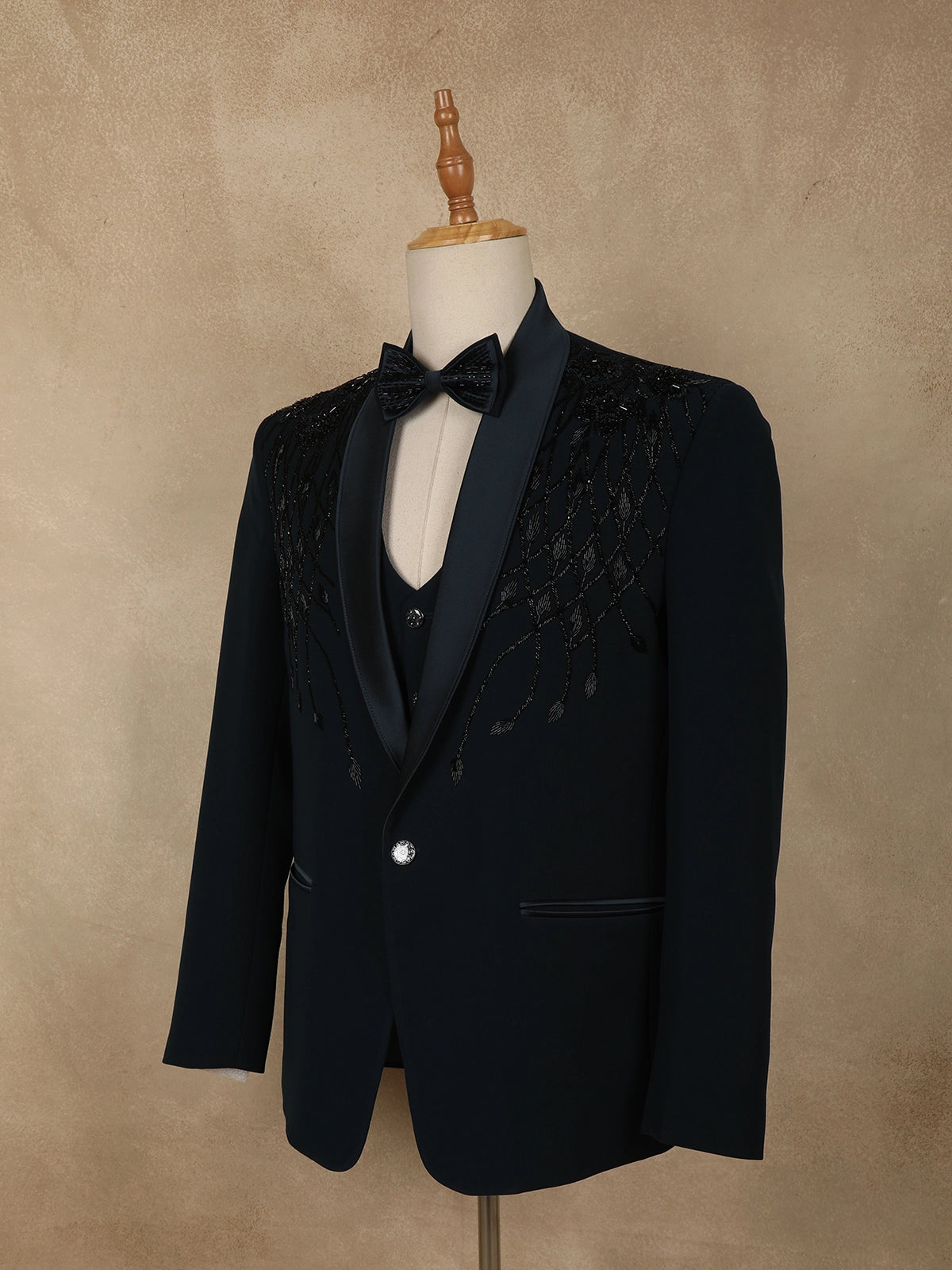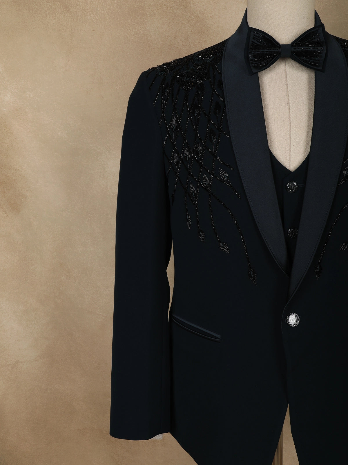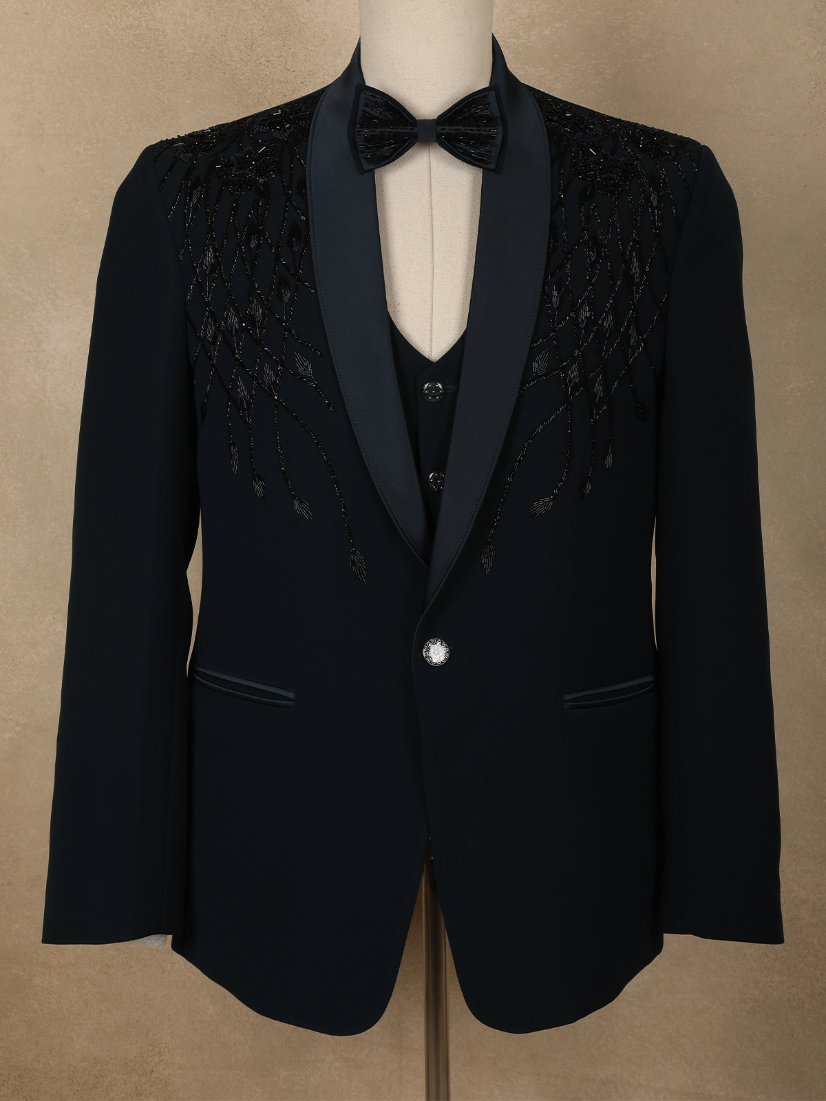 Tailored from premium polynosic fabric, the suit offers a smooth finish, structured silhouette, and comfortable wear, making it ideal for long celebrations. The classic satin-finish shawl lapel enhances the formal appeal, while the sharp tailoring ensures a sleek, contemporary fit. Finished with a single-button closure and neatly detailed pockets, the design balances statement embellishment with timeless tailoring.