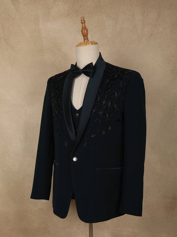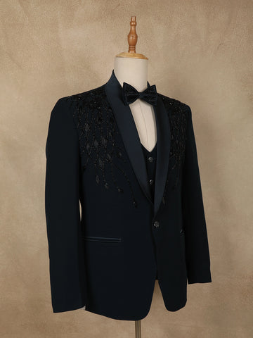 Teal Blue Intricate Black Beads Embroidered Design Polynosic Men's Suit