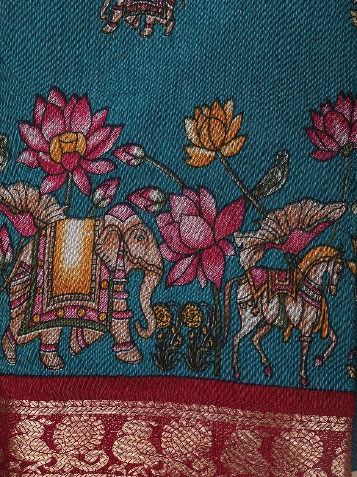 Teal Blue Kalamkari Floral and Animal Motif Printed Chanderi Cotton Saree with Maroon Zari Border