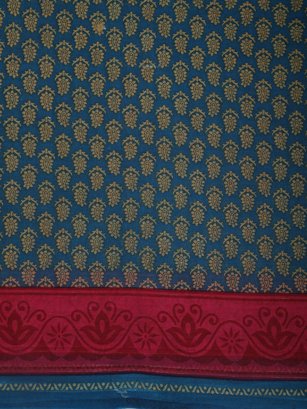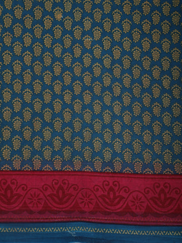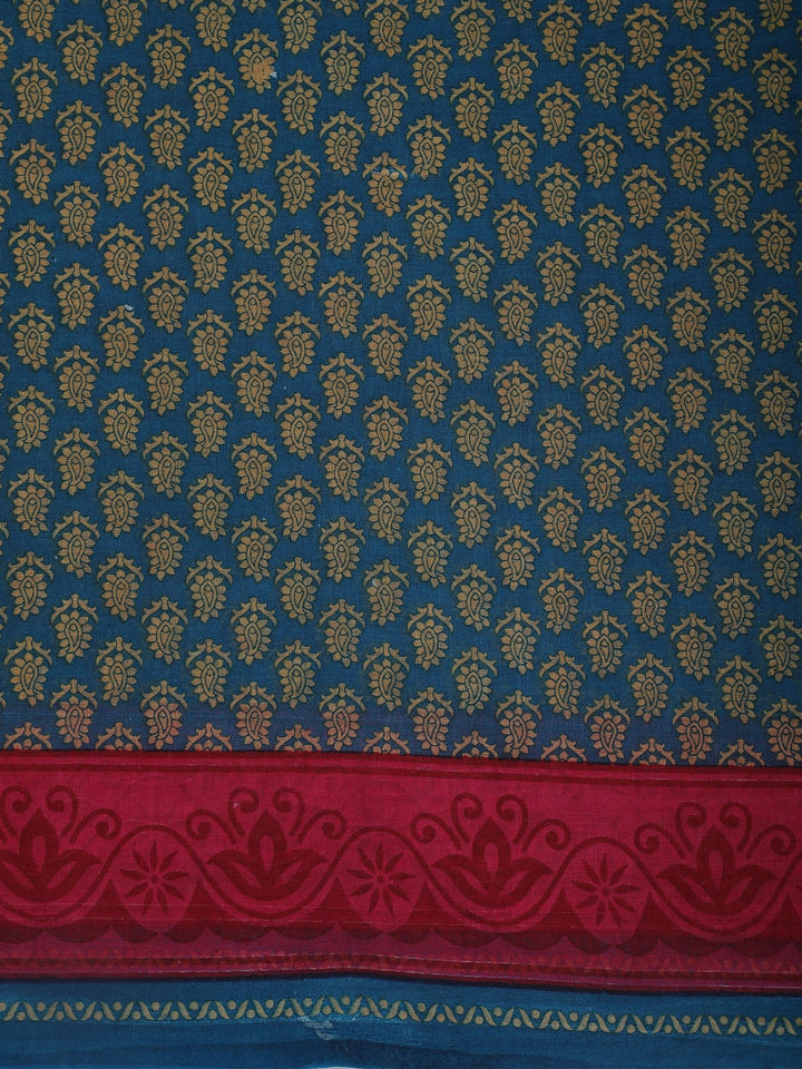 Add a touch of everyday elegance to your wardrobe with this stunning teal blue cotton saree, adorned with intricate paisley-inspired printed motifs in soft golden-beige tones. The repeating all-over pattern gives the saree a rich, traditional look while maintaining a subtle and graceful appeal.