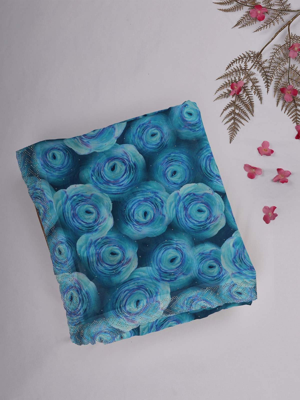 Make a statement of effortless beauty with this captivating Teal Blue Chiffon Saree, designed with a stunning all-over rose floral print that blends shades of teal, aqua, and hints of violet for a dreamy, artistic finish. The soft watercolor-effect blooms give the saree a refreshing and modern charm.
