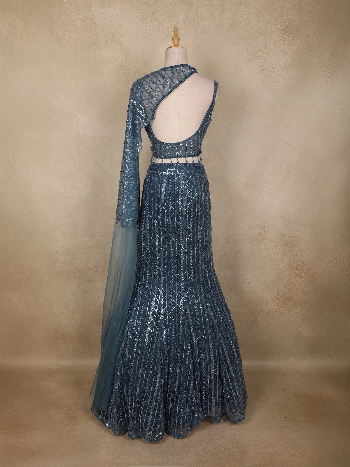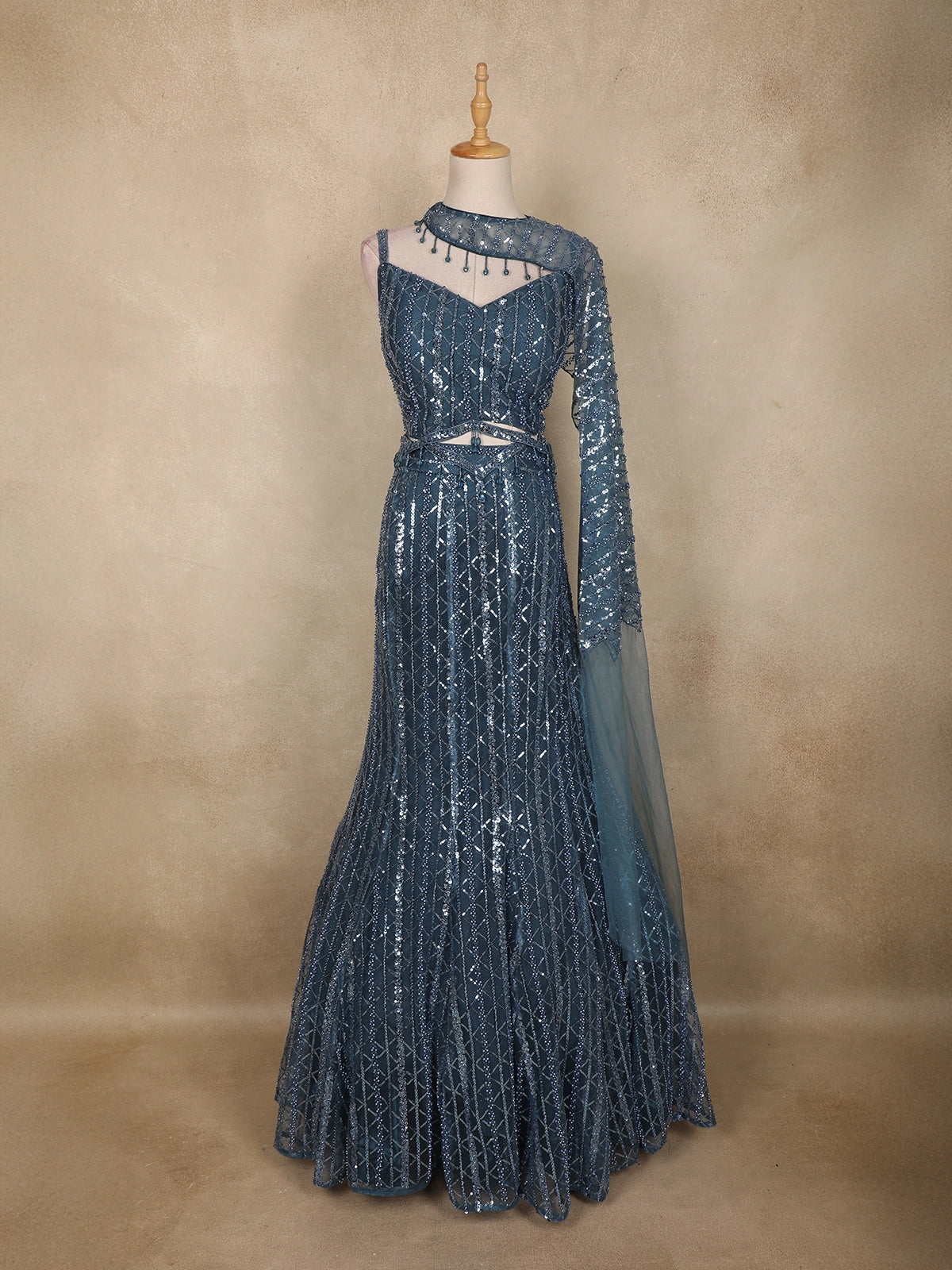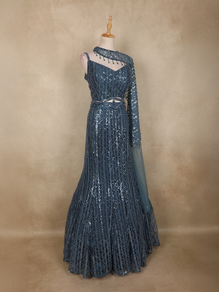 Teal Blue Sequins and Bead Embroidered Net Mermaid Lehenga Set