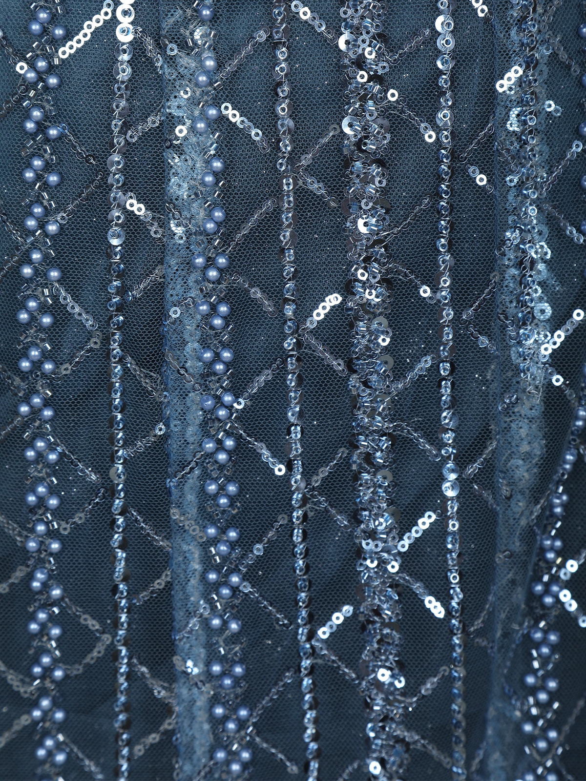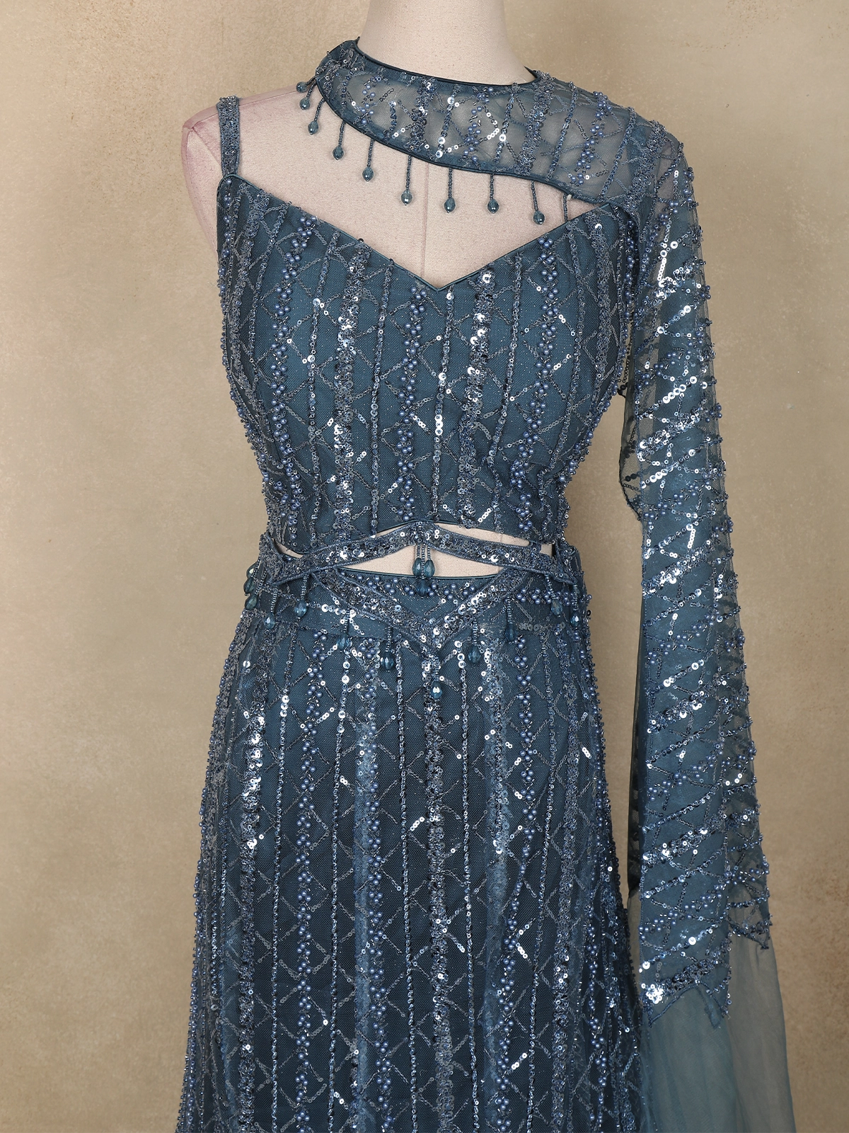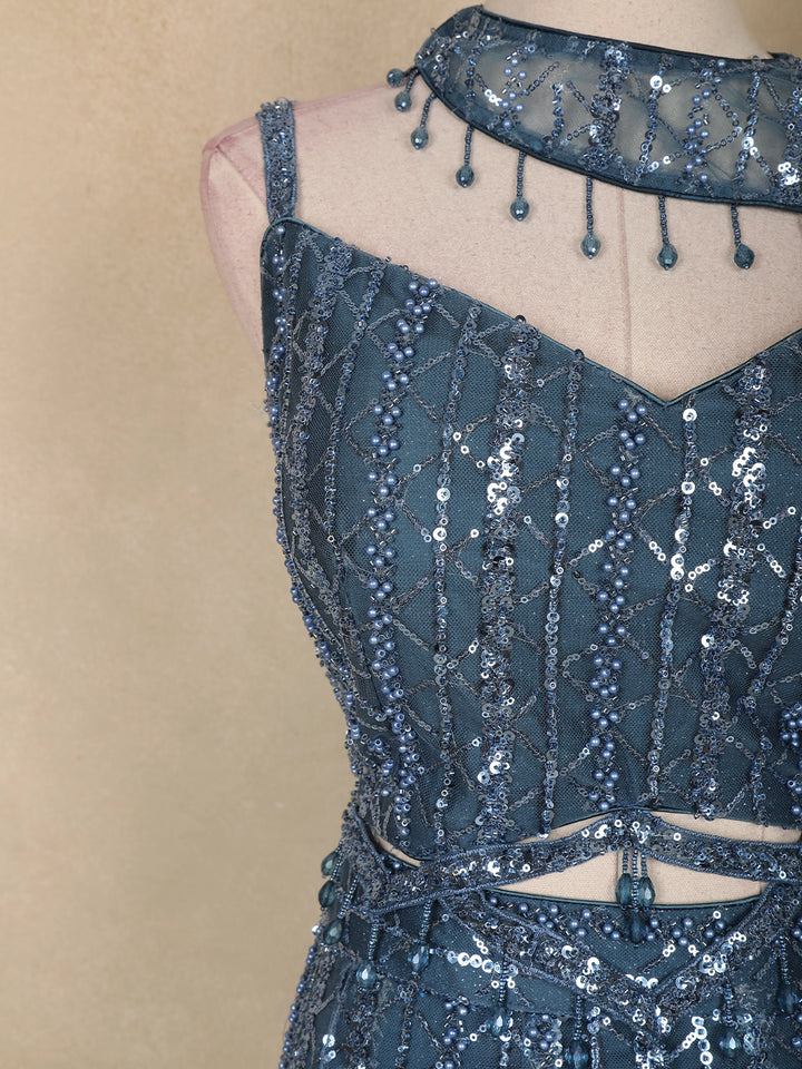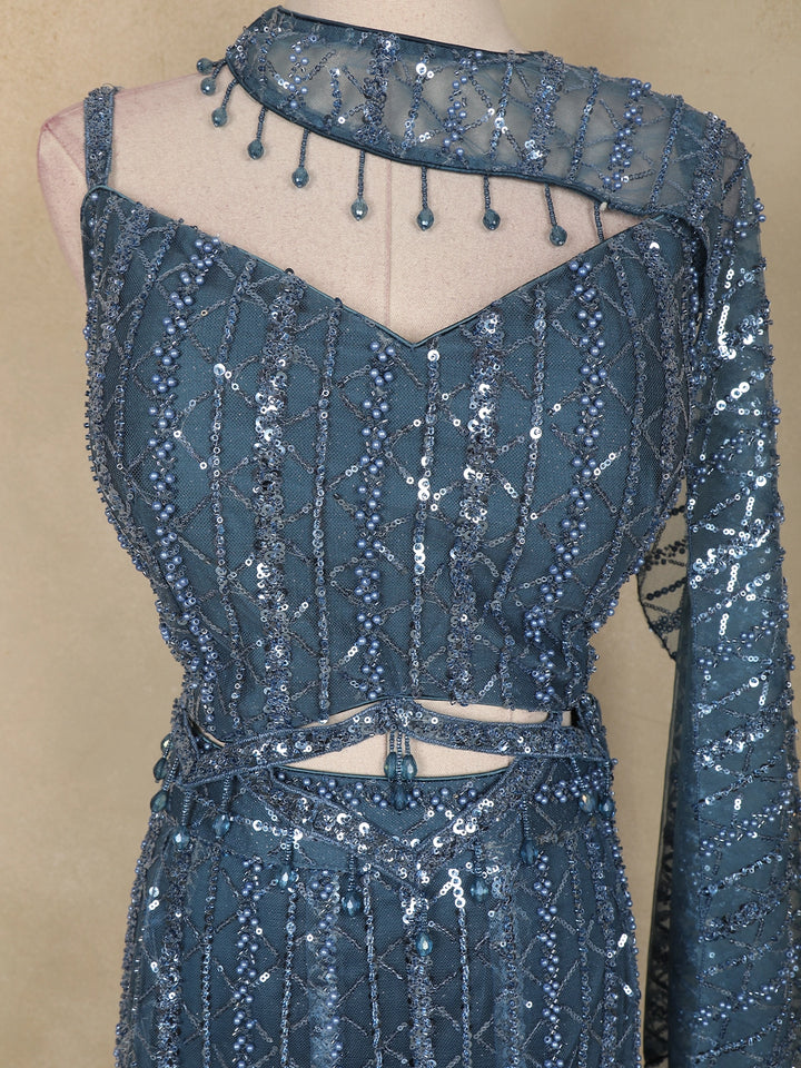 Teal Blue Sequins and Bead Embroidered Net Mermaid Lehenga Set