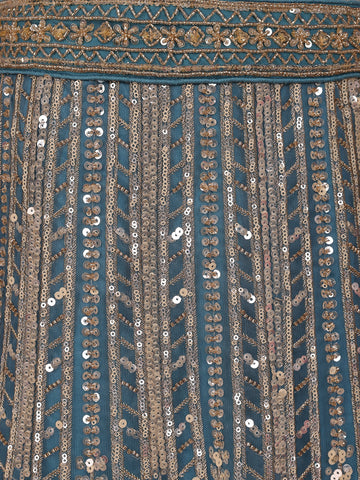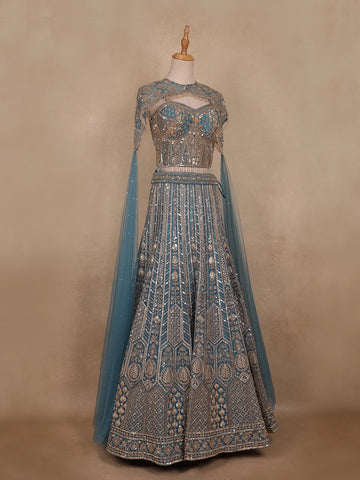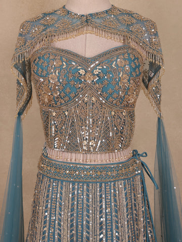 Teal Blue Sequins Embroidered Design Net Lehenga with Cape Dupatta