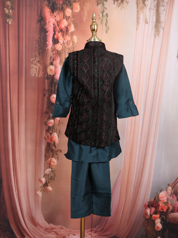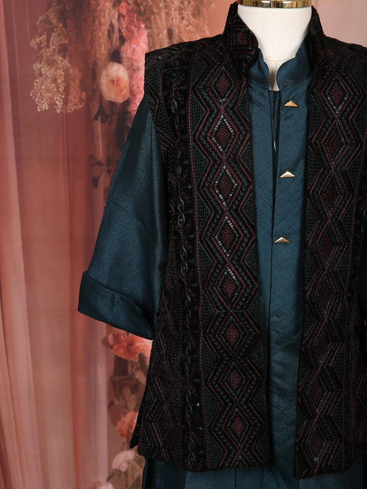 Teal Blue Silk Kurta Set with Embroidered Jacket for Boys