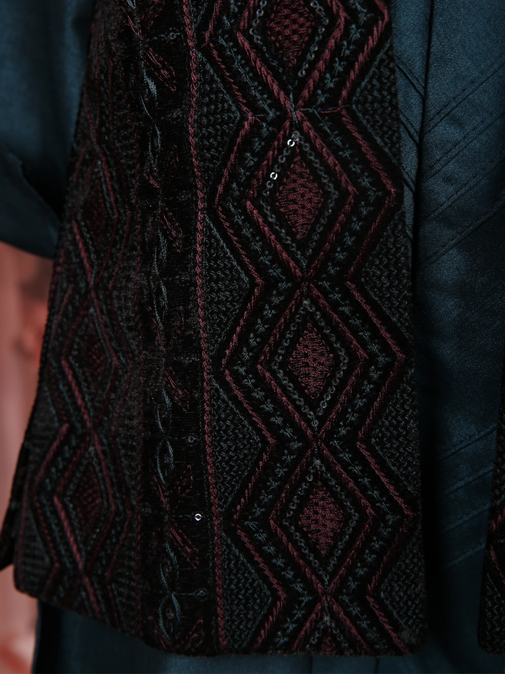Give your little gentleman a royal festive upgrade with this Teal Blue Silk Kurta Set, paired with a rich embroidered jacket. The kurta comes in a luxurious silk finish with a mandarin collar and elegant button detailing, ensuring a classy traditional look. The sleeveless jacket features intricate thread embroidery in deep shades, adding dimension and festive elegance to the ensemble.