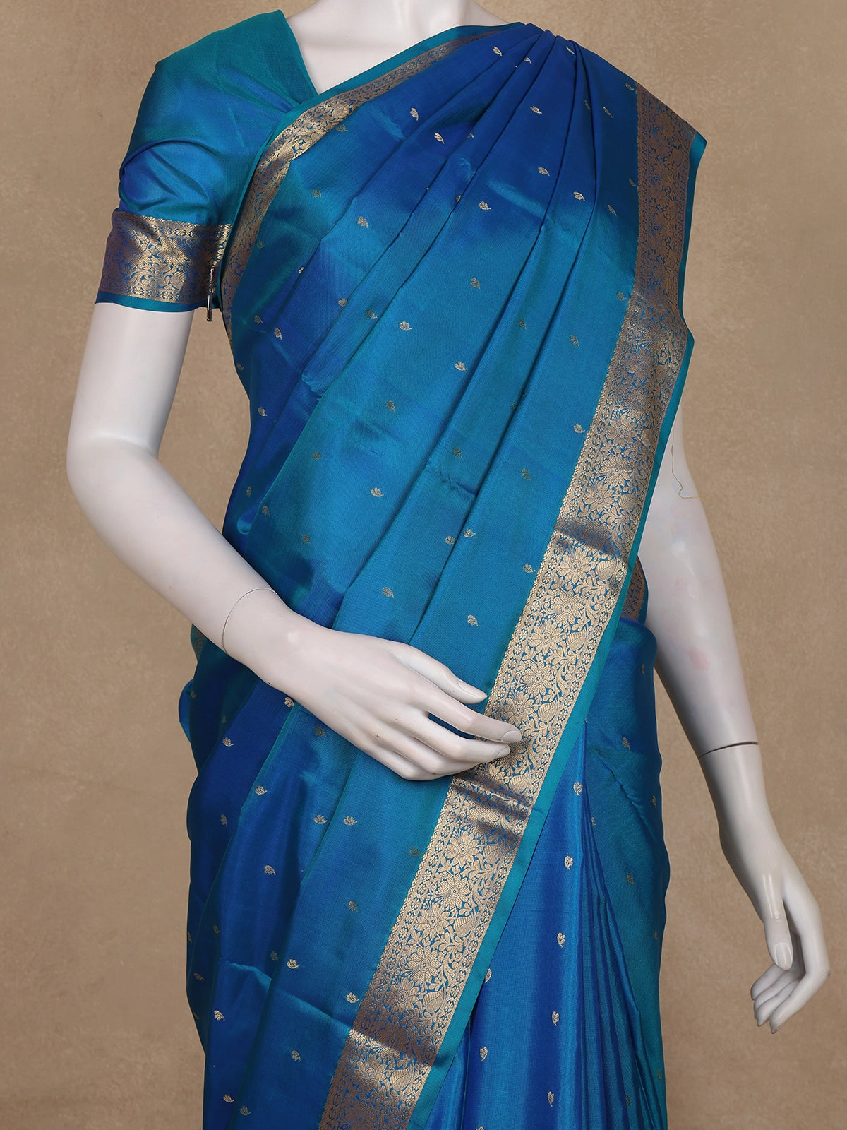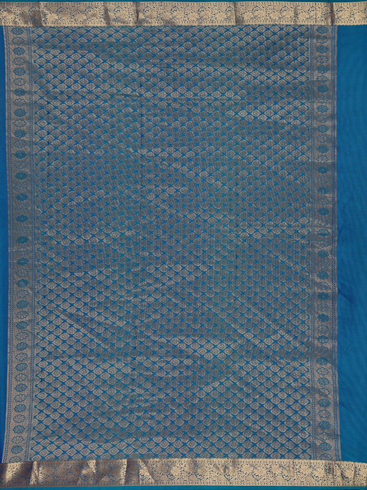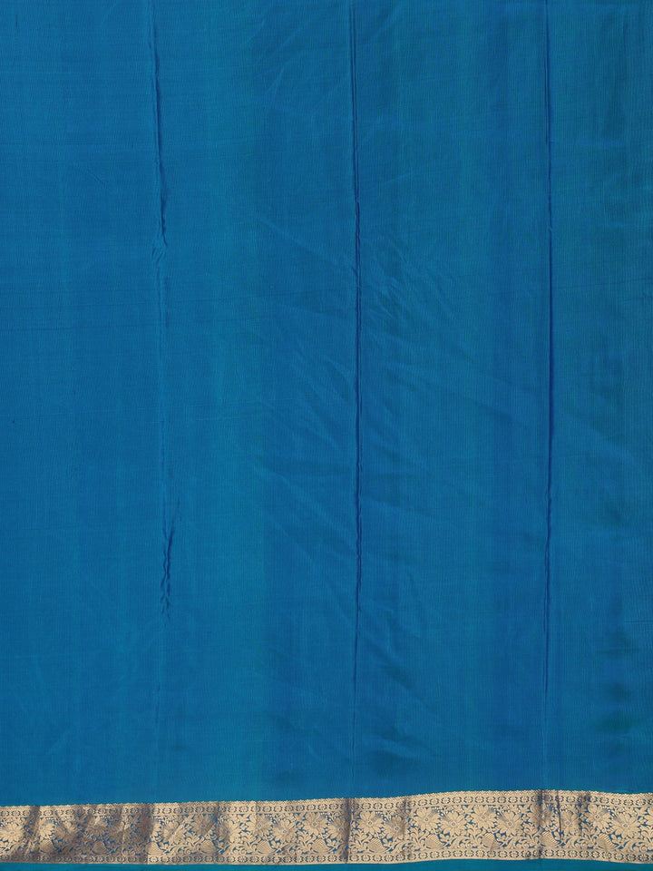 A beautifully crafted gold zari border adds a charming frame of opulence, featuring floral artistry inspired by age-old Kanchipuram weaving traditions. The matching pallu carries exquisite zari motifs, enhancing the grand appeal while keeping the design elegantly balanced. Paired with a matching blue silk blouse, this ensemble forms a flawless fusion of culture and contemporary elegance.