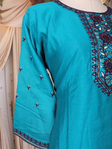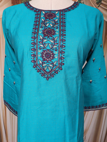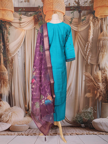Step into everyday elegance with this Teal Blue Solid Cotton Straight-Cut Salwar Suit, adorned with delicate embroidery along the neckline and sleeves. Crafted from breathable cotton, this outfit ensures a soft and comfortable fit, perfect for long wear during any season. The round neck and straight silhouette enhance the graceful simplicity of the ensemble, while the contrast floral dupatta in rich tones adds a touch of vibrancy and sophistication. Ideal for casual outings, festive gatherings, or ethnic events, this suit combines timeless design with subtle craftsmanship — making it a versatile addition to your wardrobe.