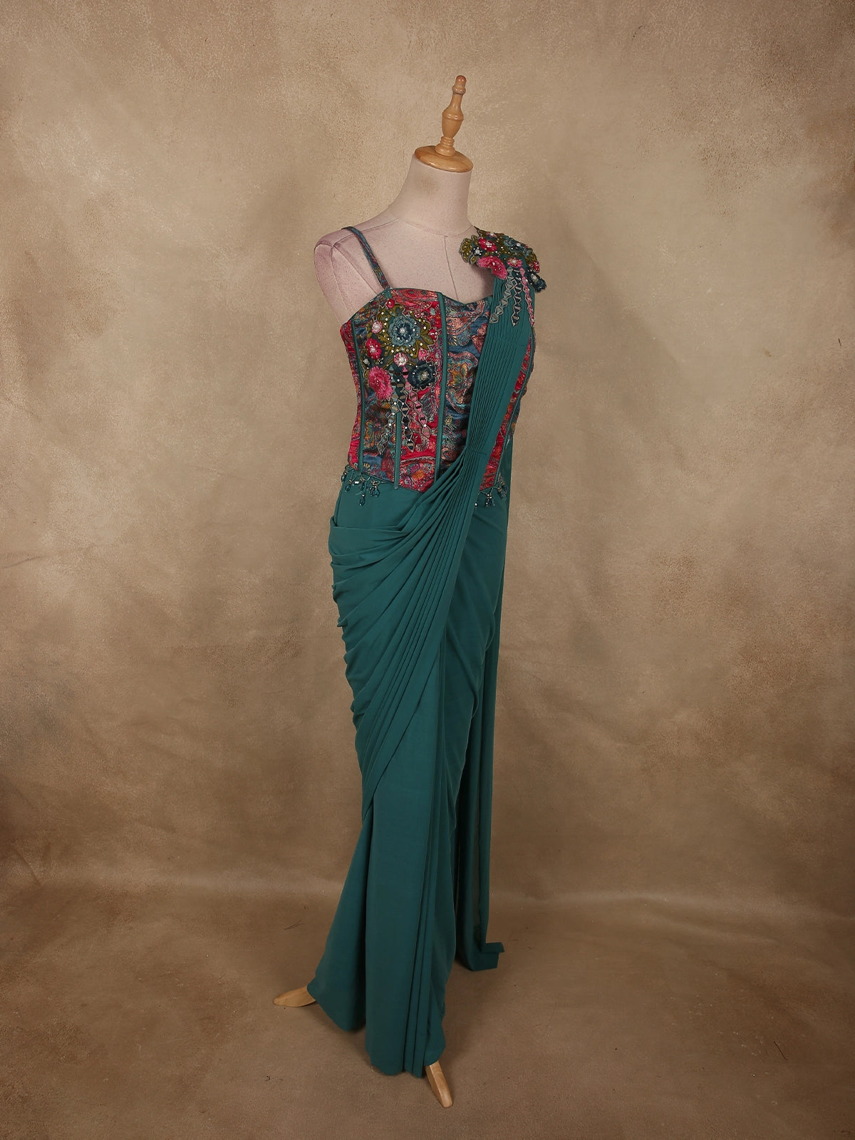 The fitted bodice combined with the fluid saree drape creates a perfectly balanced silhouette — structured at the top and flowy at the bottom.