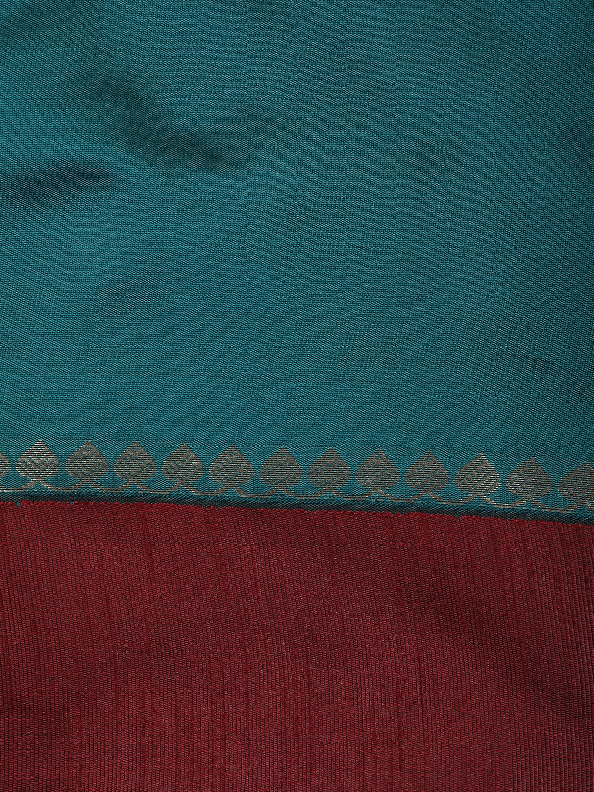 The saree is beautifully complemented by a contrast maroon border, intricately woven with delicate silver zari motifs, adding a refined traditional touch while keeping the overall look minimal and classy. The solid design highlights the richness of the silk and makes this saree a versatile choice for multiple occasions.