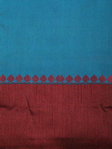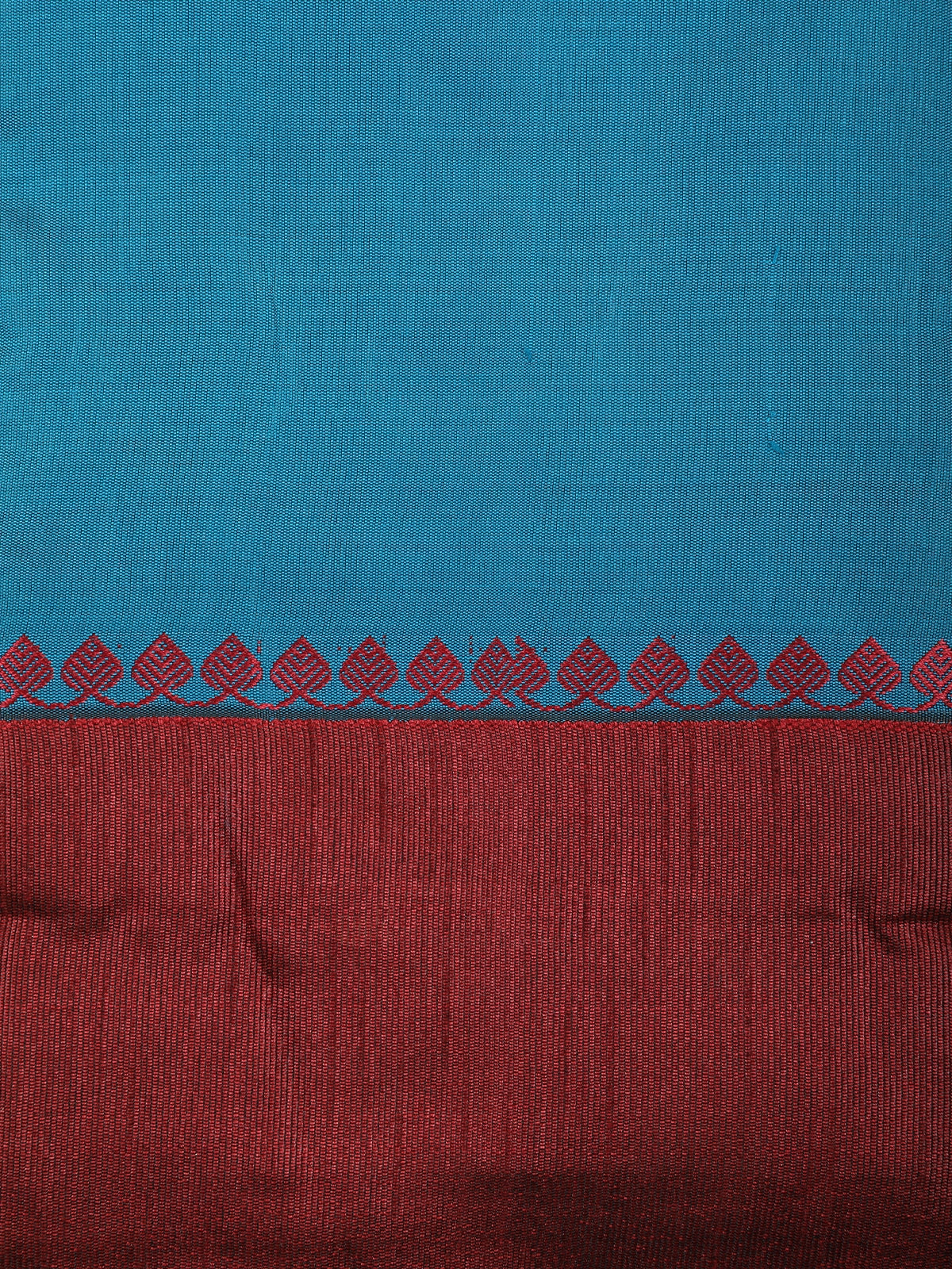 The saree is accentuated with a contrasting maroon border, woven with subtle zari detailing that adds depth and traditional charm. The fine zari work along the border enhances the overall appeal without overpowering the elegant solid base, creating a perfect balance of simplicity and grandeur.