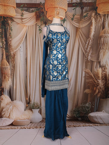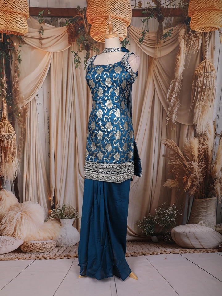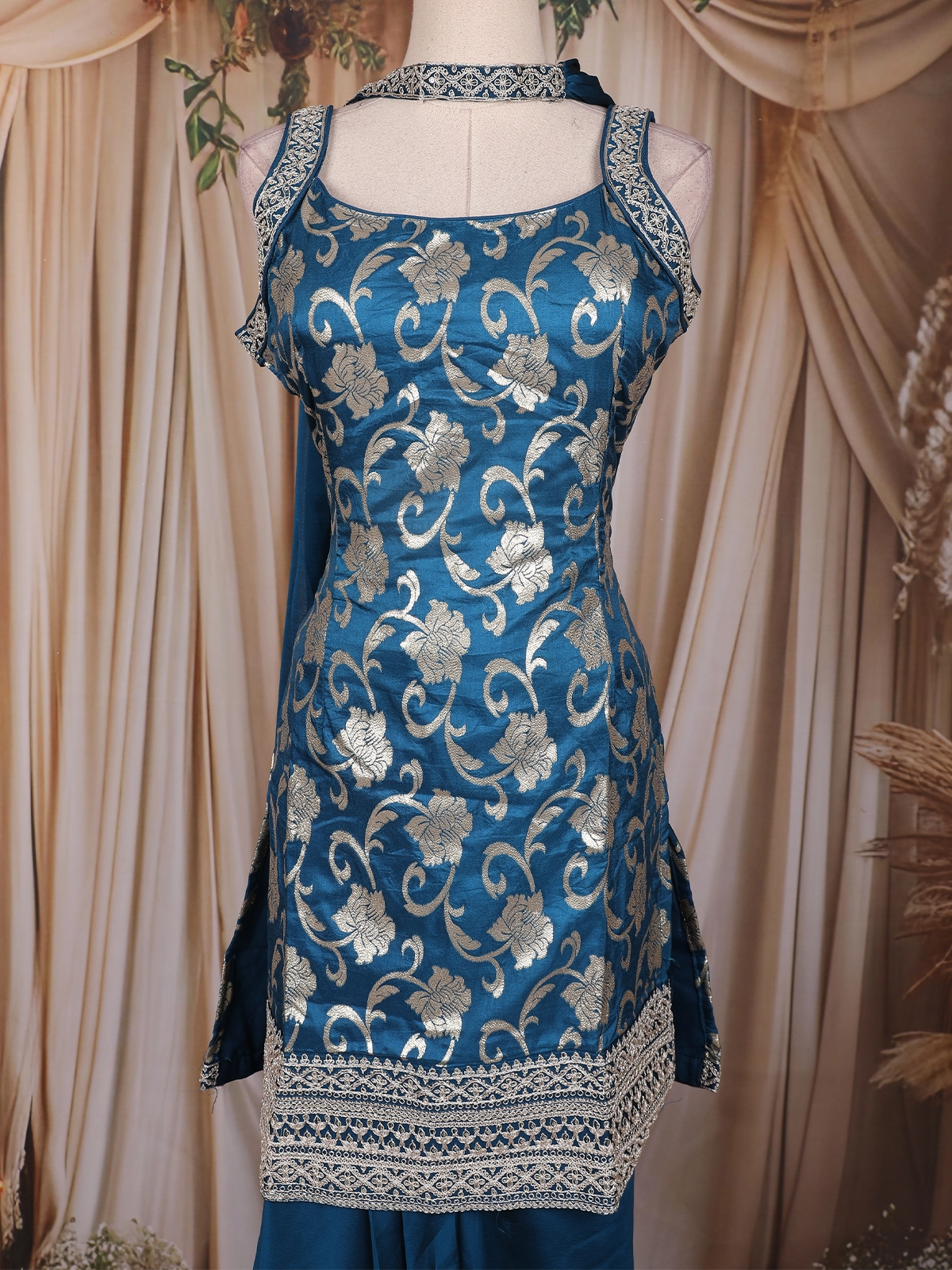 Teal Blue Zari Woven Design Silk Palazzo Suit with Dupatta