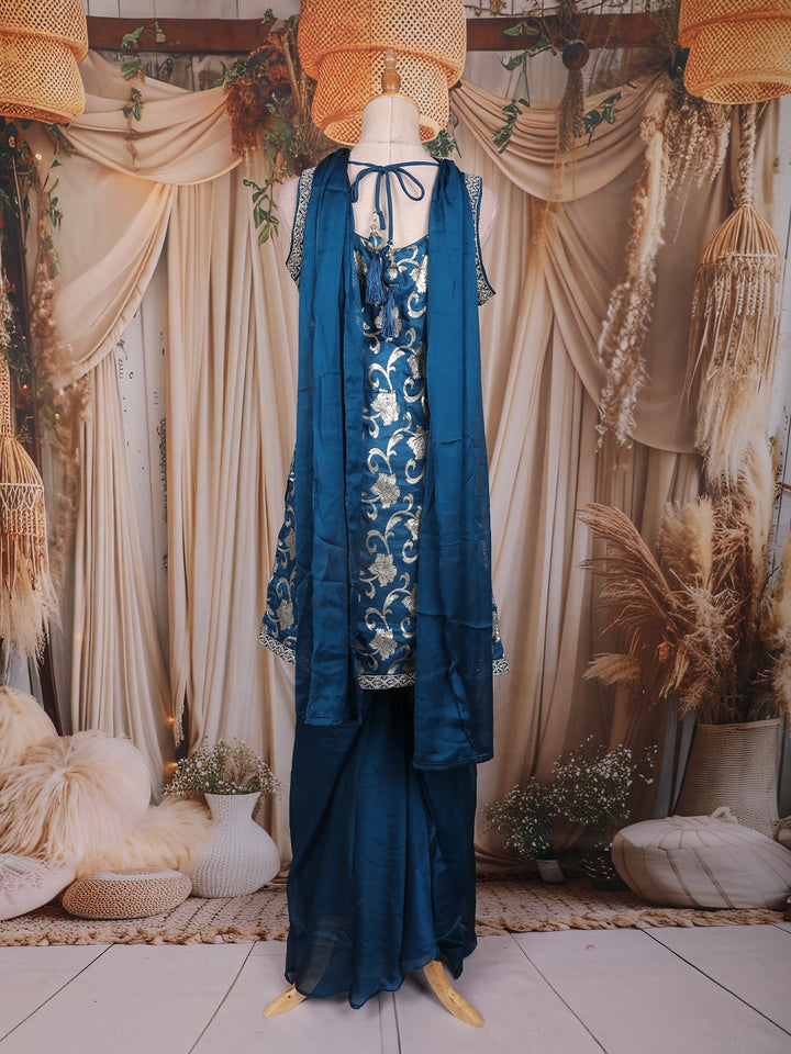 Step into sheer elegance with this Teal Blue Zari Woven Silk Palazzo Suit, a breathtaking fusion of regal craftsmanship and modern poise. Designed to radiate grandeur, this ensemble is perfect for festive occasions, receptions, and evening gatherings.