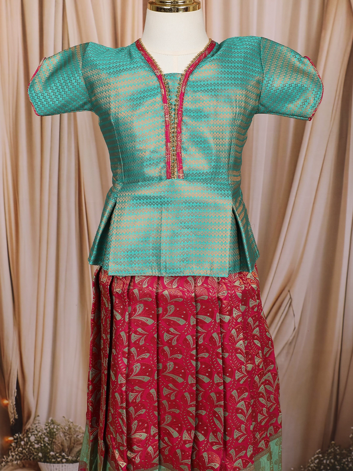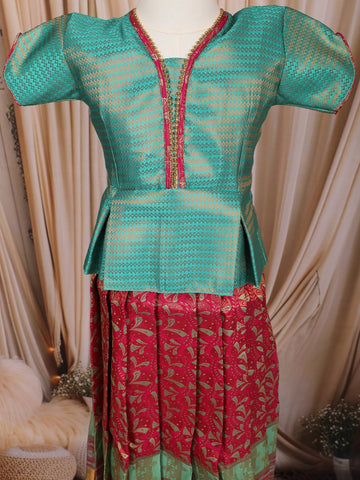 Teal Green and Red Zari Woven Art Silk Kids Pattu Pavadai