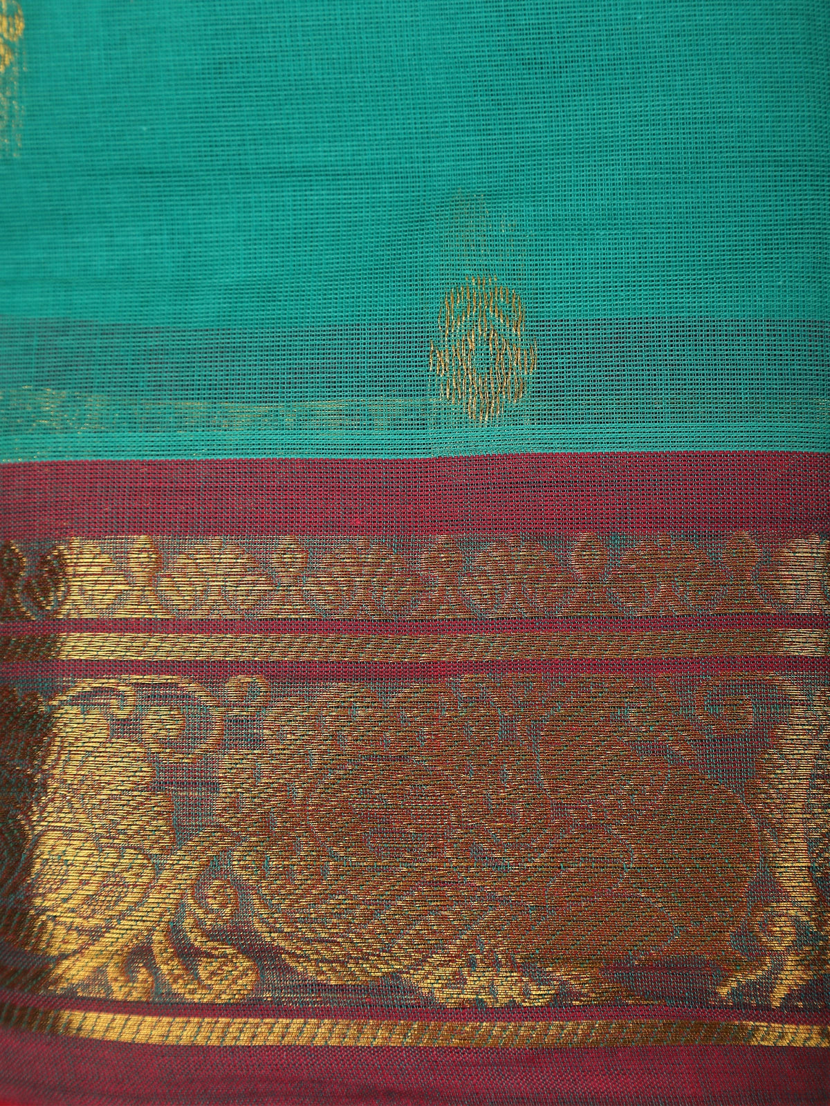 The vibrant teal green base is perfectly complemented by a contrast maroon border, richly detailed with intricate gold zari floral weaving that lends a classic South Indian touch. Crafted from soft, breathable cotton, this saree drapes smoothly and ensures all-day ease, making it ideal for both work and leisurely occasions.