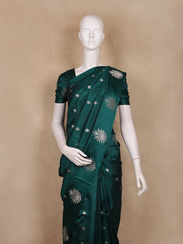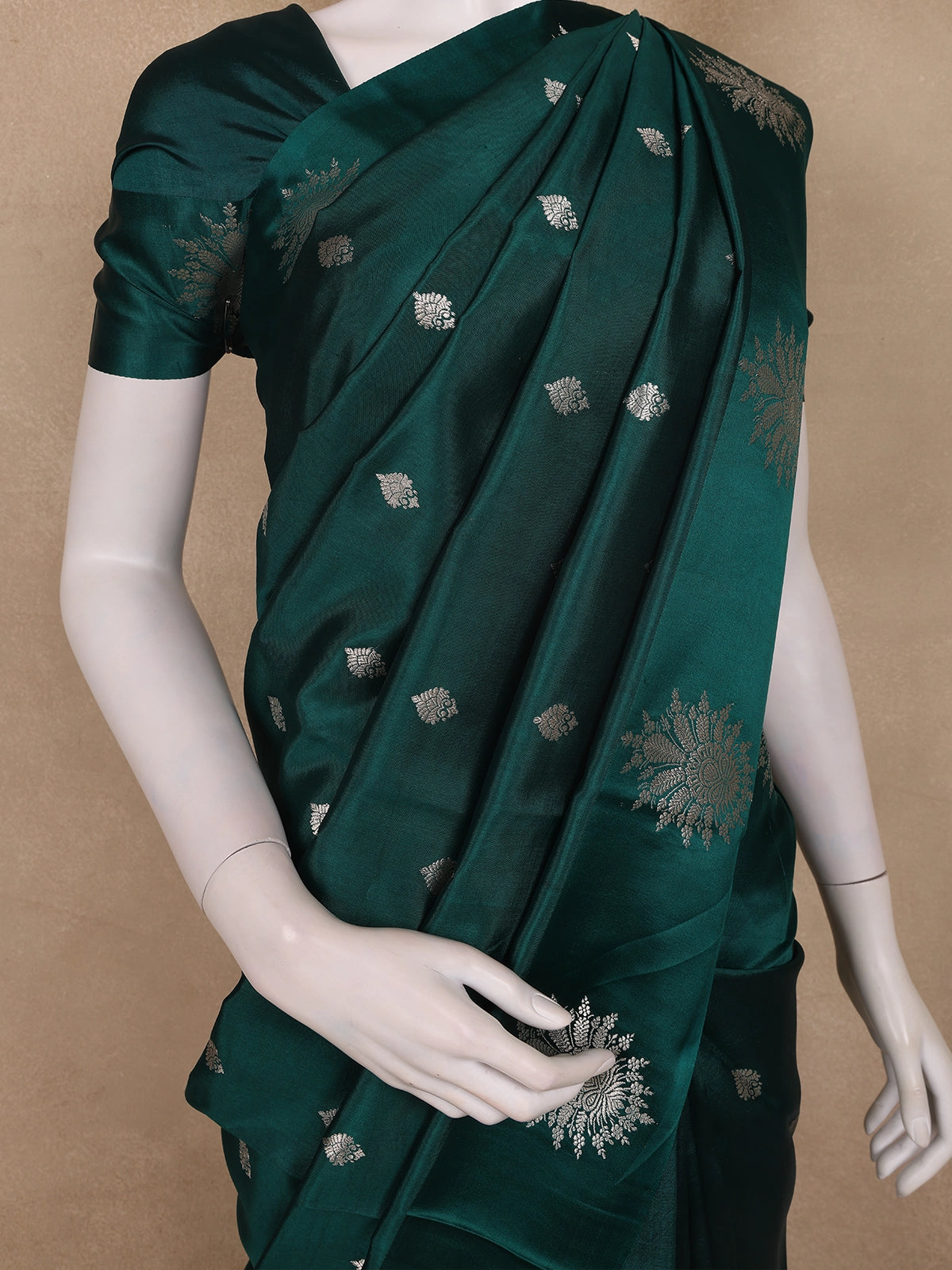 The matching green blouse and pallu lend a seamless continuity to the saree’s royal tone, while the zari border adds a touch of regal allure. Soft yet structured, this saree drapes beautifully, making it an ideal choice for weddings, festive occasions, and traditional gatherings where elegance takes center stage.