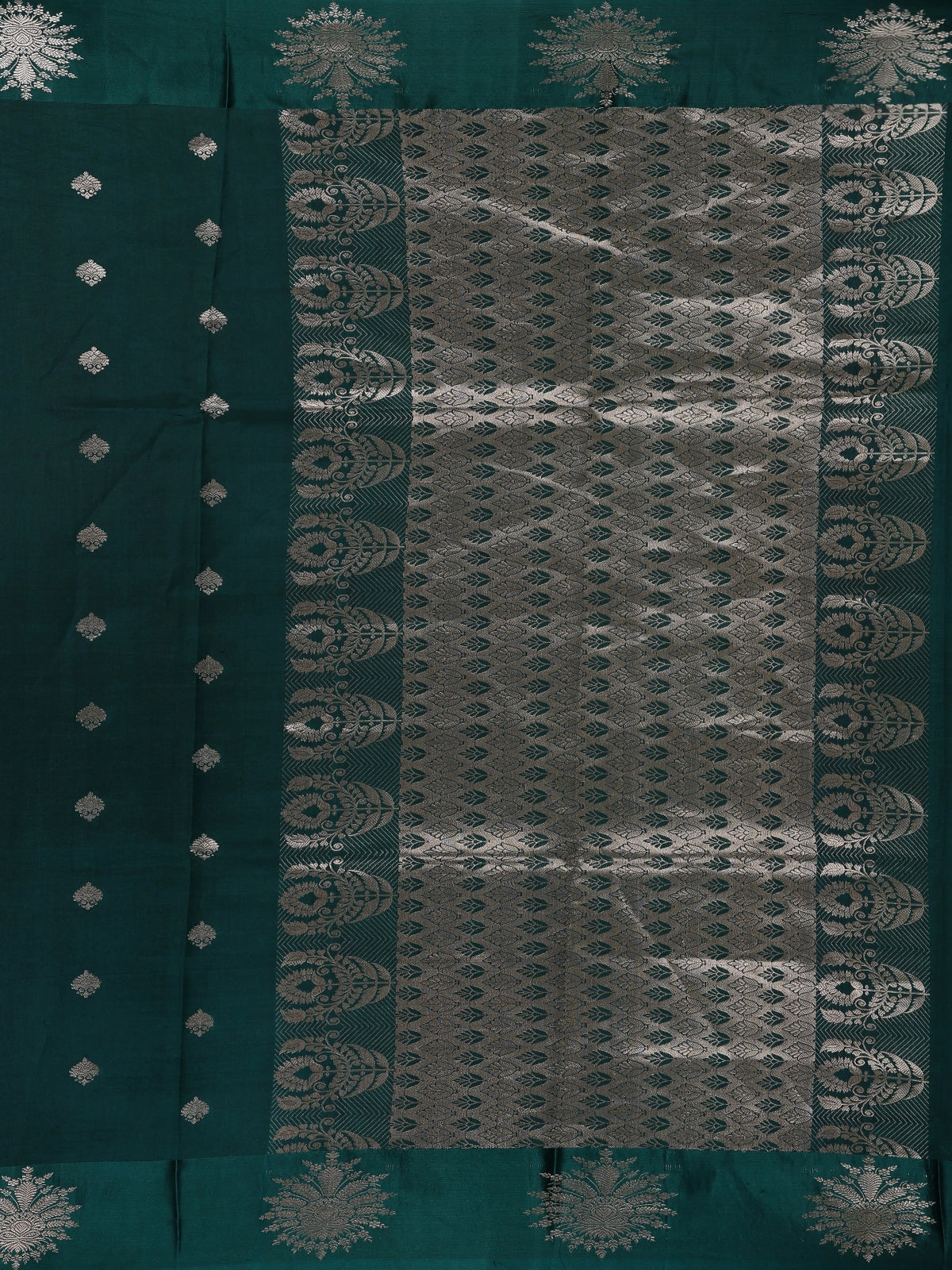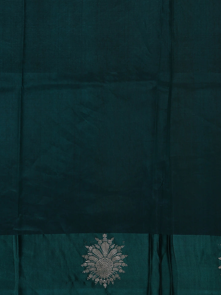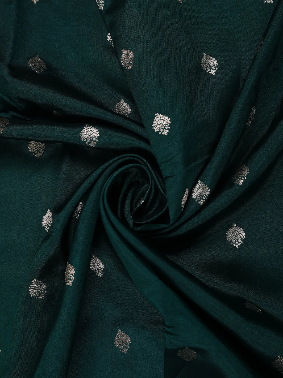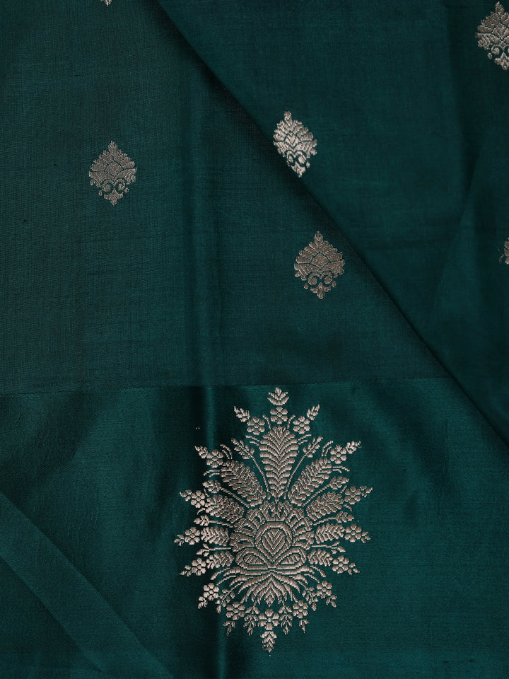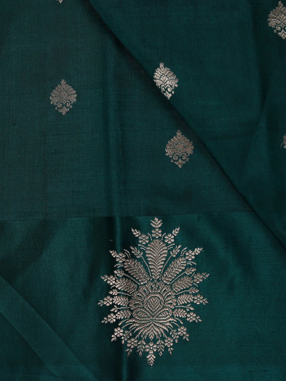 Ethereal and timeless, this Teal Green Butta Woven Katan Banarasi Saree is a masterpiece that celebrates the splendor of Banaras weaving. Crafted from luxurious Katan silk, it features exquisite silver zari buttas intricately woven across the body, creating a graceful interplay of shimmer and sophistication.