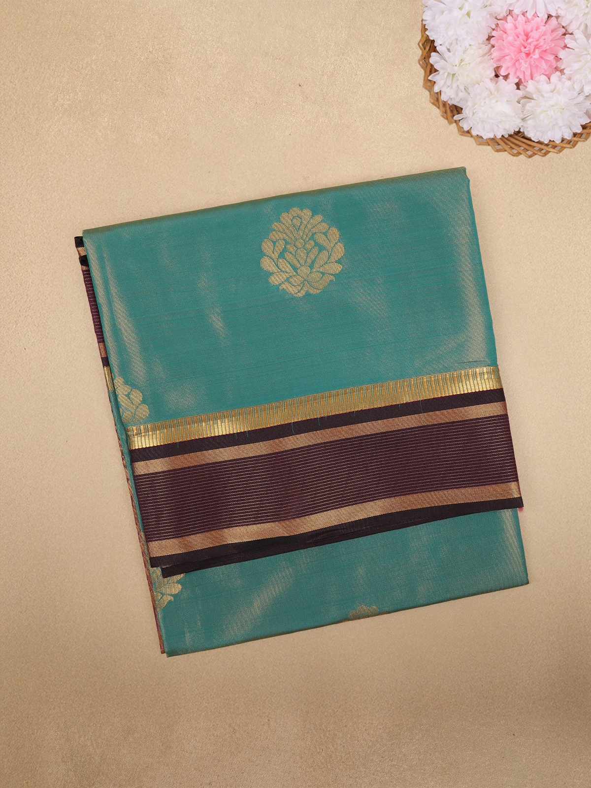 A graceful blend of sheen and tradition, this Teal Green Tissue Saree features elegant gold zari butta motifs that add a subtle festive charm to the drape. The contrasting maroon border with intricately woven zari lends a luxurious finish, making it a beautiful pick for celebrations, gifting, and special gatherings. Lightweight and easy to carry, this saree ensures comfort with style for any occasion.