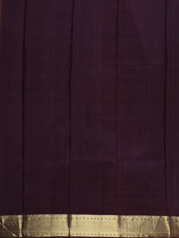 The saree is beautifully contrasted with a bold deep purple border, intricately adorned with peacock-inspired antique gold zari motifs that lend a regal and heritage-rich charm. The majestic peacock detailing brings traditional symbolism and grandeur, while the contrast border frames the saree with striking sophistication. The pallu continues the same rich palette, finished with ornate zari accents.