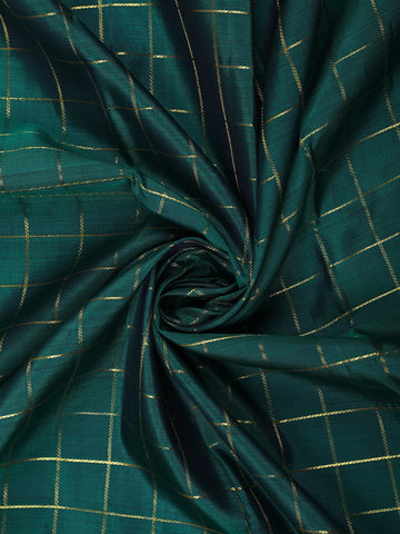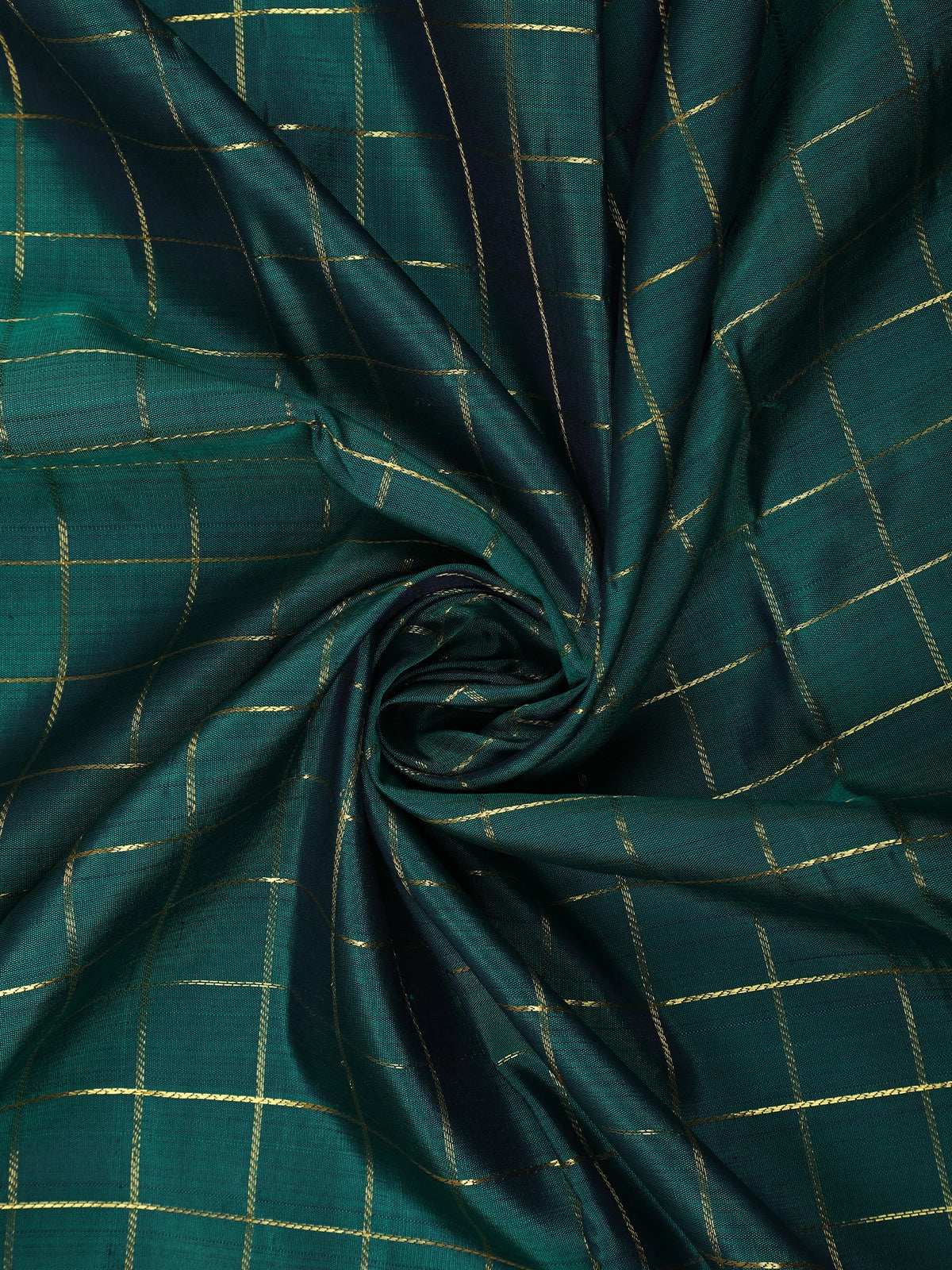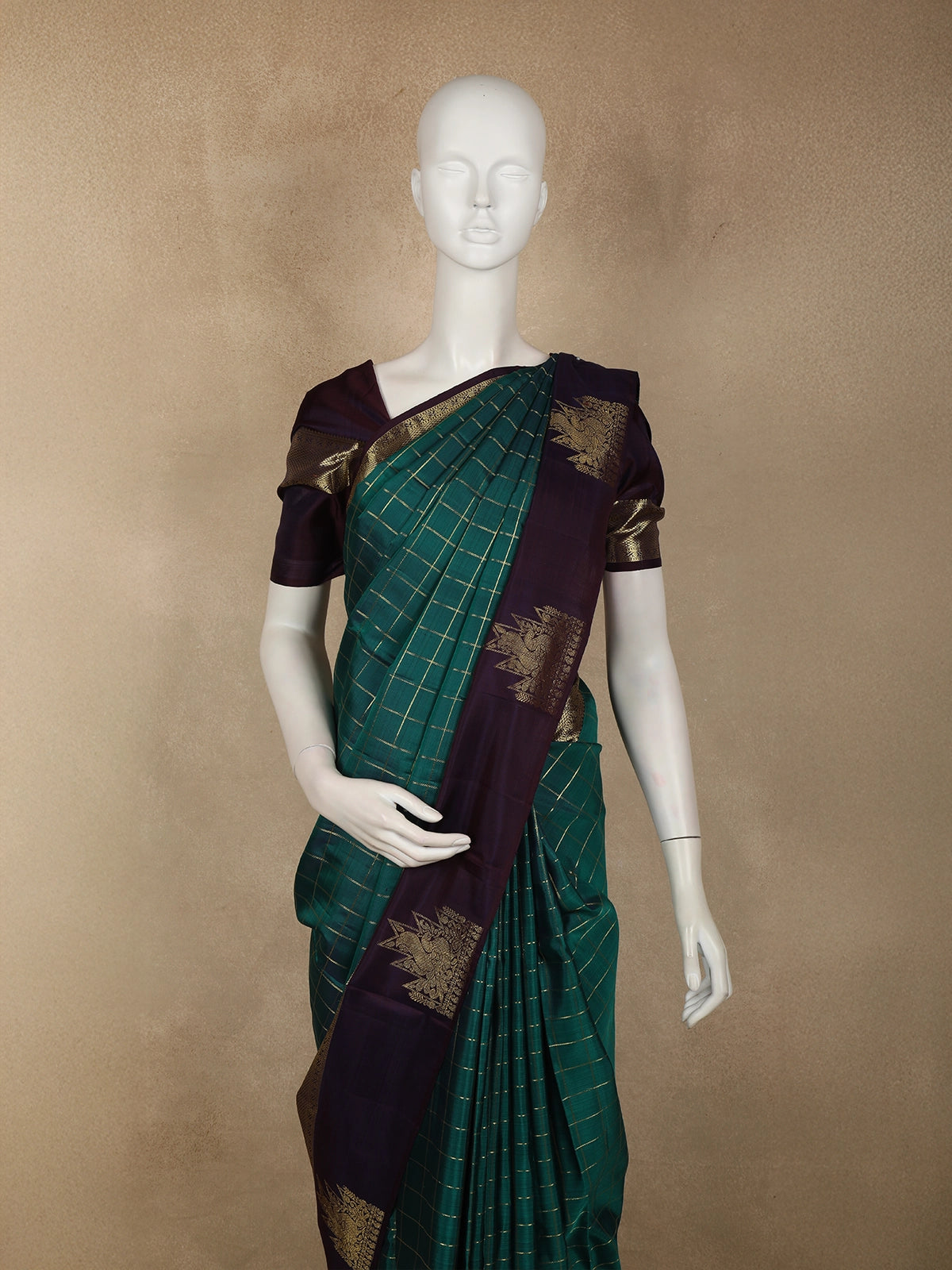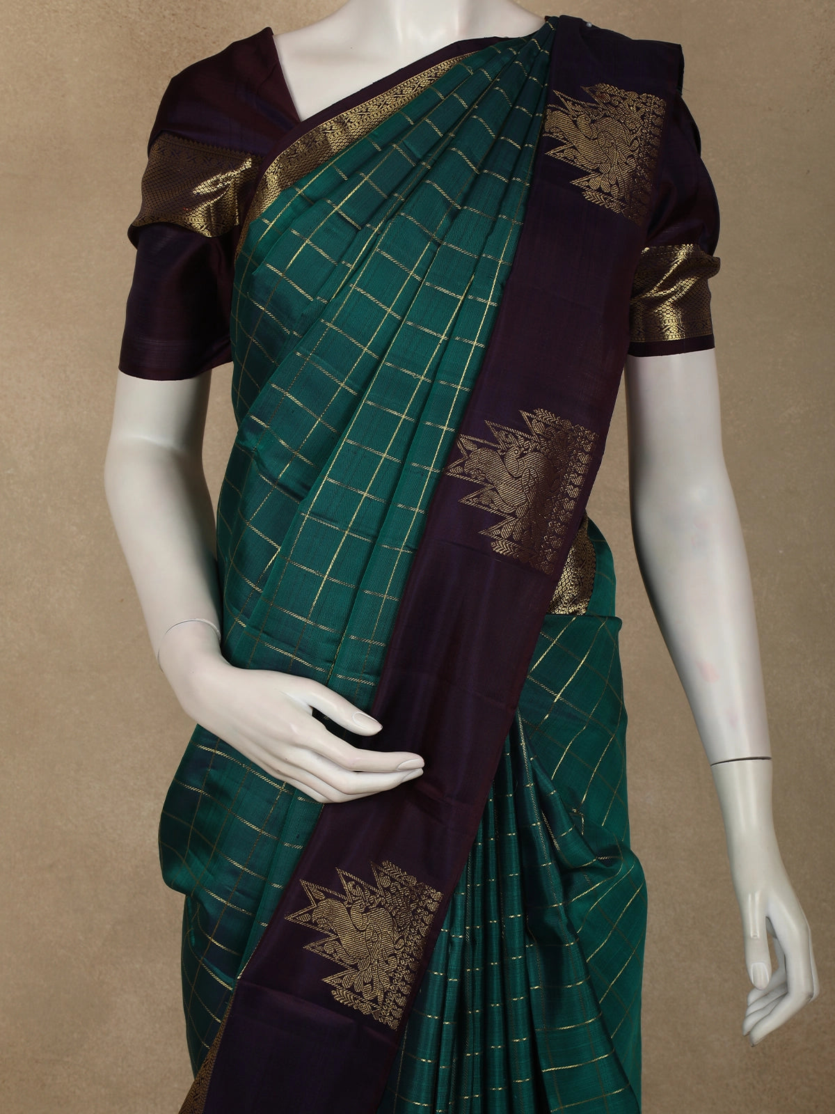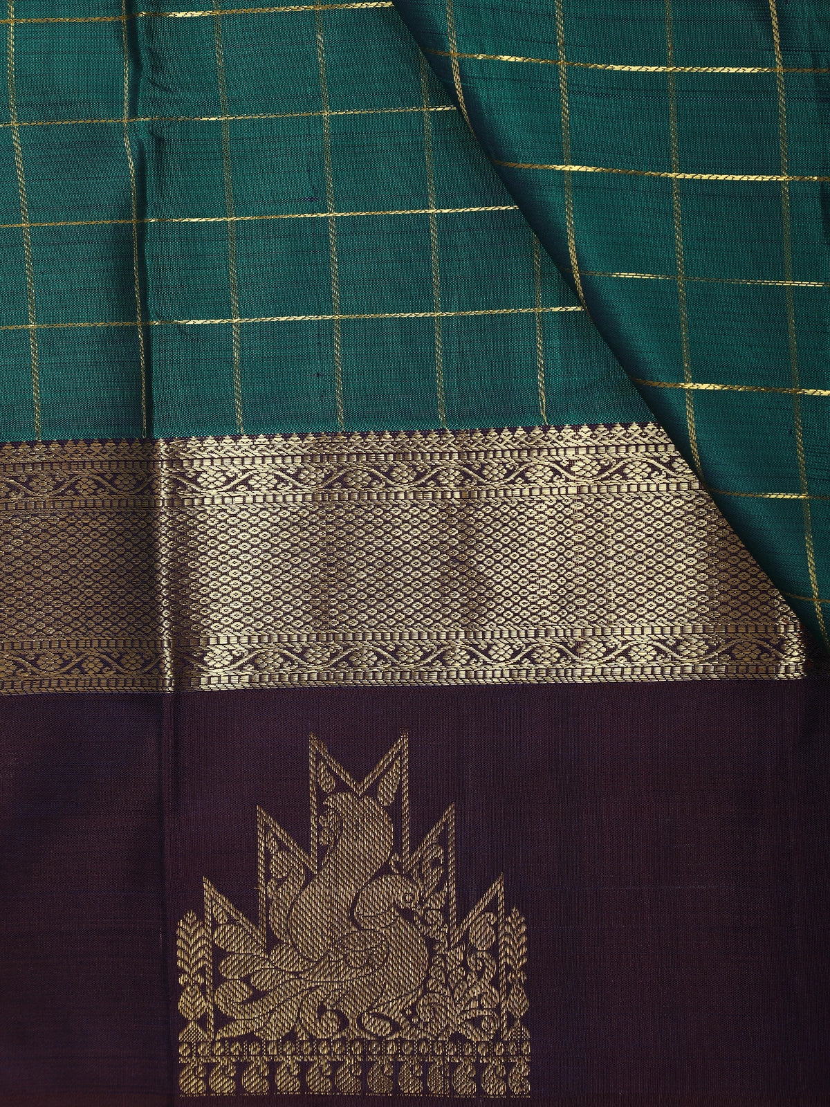 Teal Green Checked Woven Design Pure Kanchipuram Silk Saree with Contrast Peacock Border